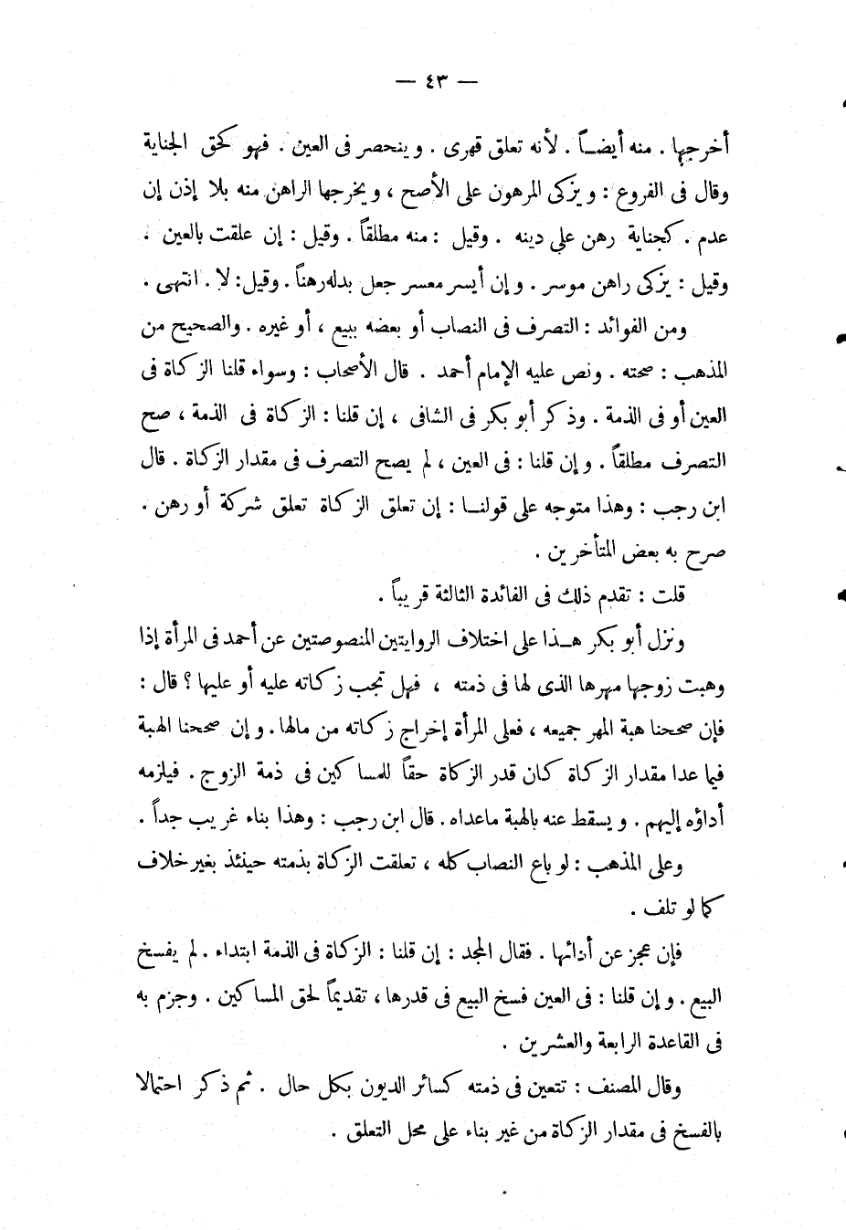 قَالَ الْأَصْحَابُ: وَسَوَاءٌ قُلْنَا الزَّكَاةُ فِي الْعَيْنِ أَوْ فِي الذِّمَّةِ، وَذَكَرَ أَبُو بَكْرٍ فِي الشَّافِي، إنْ قُلْنَا: الزَّكَاةُ فِي الذِّمَّةِ، صَحَّ التَّصَرُّفُ مُطْلَقًا، وَإِنْ قُلْنَا: فِي الْعَيْنِ، لَمْ يَصِحَّ التَّصَرُّفُ فِي مِقْدَارِ الزَّكَاةِ، قَالَ ابْنُ رَجَبٍ: وَهَذَا مُتَوَجِّهٌ عَلَى قَوْلِنَا: إنَّ تَعَلُّقَ الزَّكَاةِ تَعَلُّقُ شَرِكَةٍ أَوْ رَهْنٍ، صَرَّحَ بَعْضُ الْمُتَأَخِّرِينَ، قُلْت: تَقَدَّمَ ذَلِكَ فِي الْفَائِدَةِ الثَّالِثَةِ قَرِيبًا، وَنَزَّلَ أَبُو بَكْرٍ هَذَا عَلَى اخْتِلَافِ الرِّوَايَتَيْنِ الْمَنْصُوصَتَيْنِ عَنْ أَحْمَدَ فِي الْمَرْأَةِ إذَا وَهَبَتْ زَوْجَهَا مَهْرَهَا الَّذِي لَهَا فِي ذِمَّتِهِ، فَهَلْ تَجِبُ زَكَاتُهُ عَلَيْهِ أَوْ عَلَيْهَا؟ قَالَ: فَإِنْ صَحَّحْنَا هِبَةَ الْمَهْرِ جَمِيعِهِ فَعَلَى الْمَرْأَةِ إخْرَاجُ زَكَاتِهِ مِنْ مَالِهَا، وَإِنْ صَحَّحْنَا الْهِبَةَ فِيمَا عَدَا مِقْدَارَ الزَّكَاةِ قَدْرُ الزَّكَاةِ حَقٌّ لِلْمَسَاكِينِ فِي ذِمَّةِ الزَّوْجِ فَيَلْزَمُهُ أَدَاؤُهُ إلَيْهِمْ، وَيَسْقُطُ عَنْهُ بِالْهِبَةِ مَا عَدَاهُ، قَالَ ابْنُ رَجَبٍ: وَهَذَا بِنَاءٌ غَرِيبٌ جِدًّا، وَعَلَى الْمَذْهَبِ: لَوْ بَاعَ النِّصَابَ كُلَّهُ، تَعَلَّقَتْ الزَّكَاةُ بِذِمَّتِهِ حِينَئِذٍ بِغَيْرِ خِلَافٍ كَمَا لَوْ تَلِفَ، فَإِنْ عَجَزَ عَنْ أَدَائِهَا، فَقَالَ الْمَجْدُ: إنْ قُلْنَا: الزَّكَاةُ فِي الذِّمَّةِ ابْتِدَاءً لَمْ يُفْسَخْ الْبَيْعُ، وَإِنْ قُلْنَا: فِي الْعَيْنِ فُسِخَ الْبَيْعُ فِي قَدْرِهَا، تَقْدِيمًا لَحِقَ الْمَسَاكِينِ، وَجَزَمَ بِهِ فِي الْقَاعِدَةِ الرَّابِعَةِ وَالْعِشْرِينَ. وَقَالَ الْمُصَنِّفُ: تَتَعَيَّنُ فِي ذِمَّتِهِ كَسَائِرِ الدُّيُونِ بِكُلِّ حَالٍ ثُمَّ ذَكَرَ احْتِمَالًا بِالْفَسْخِ فِي مِقْدَارِ الزَّكَاةِ مِنْ غَيْرً بِنَاءٍ عَلَى مَحَلِّ التَّعَلُّقِ.