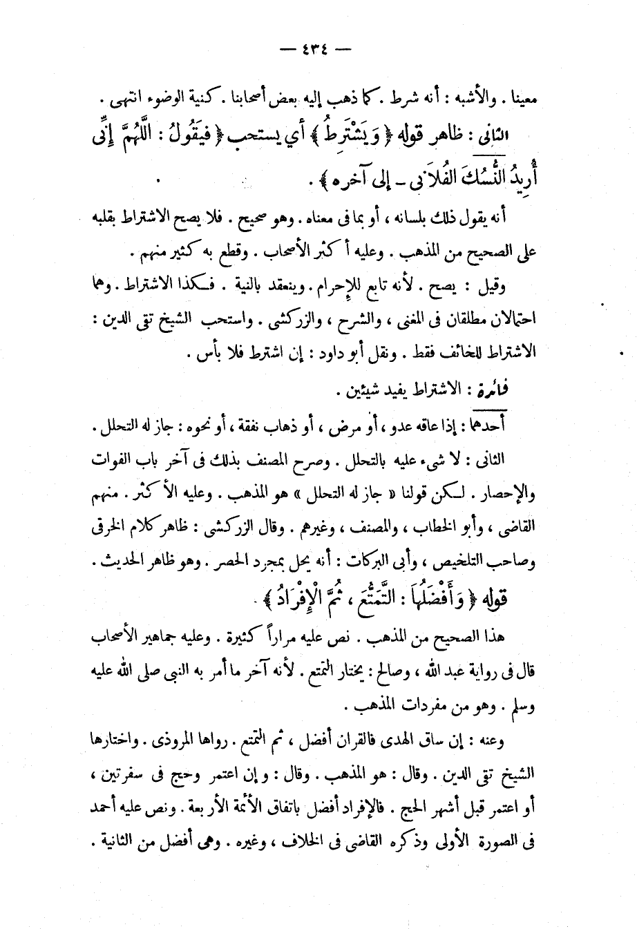الثَّانِي: ظَاهِرُ قَوْلِهِ (وَيُشْتَرَطُ) أَيْ يُسْتَحَبُّ (فَيَقُولُ: اللَّهُمَّ إنِّي أُرِيدُ النُّسُكَ الْفُلَانِيَّ إلَى آخِرِهِ) . أَنَّهُ يَقُولُ ذَلِكَ بِلِسَانِهِ، أَوْ بِمَا فِي مَعْنَاهُ، وَهُوَ صَحِيحٌ، فَلَا يَصِحُّ الِاشْتِرَاطُ بِقَلْبِهِ عَلَى الصَّحِيحِ مِنْ الْمَذْهَبِ. وَعَلَيْهِ أَكْثَرُ الْأَصْحَابِ، وَقَطَعَ بِهِ كَثِيرٌ مِنْهُمْ، وَقِيلَ: يَصِحُّ؛ لِأَنَّهُ تَابِعٌ لِلْإِحْرَامِ، وَيَنْعَقِدُ بِالنِّيَّةِ. فَكَذَا الِاشْتِرَاطُ، وَهُمَا احْتِمَالَانِ مُطْلَقَانِ فِي الْمُغْنِي، وَالشَّرْحِ، وَالزَّرْكَشِيِّ. وَاسْتَحَبَّ الشَّيْخُ تَقِيُّ الدِّينِ: الِاشْتِرَاطَ لِلْخَائِفِ فَقَطْ، وَنَقَلَ أَبُو دَاوُد: إنْ اُشْتُرِطَ فَلَا بَأْسَ.