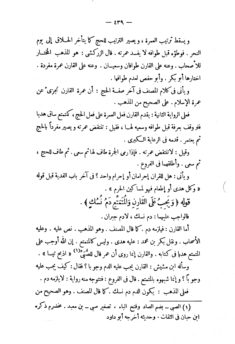 قَوْلُهُ (وَيَجِبُ عَلَى الْقَارِنِ وَالْمُتَمَتِّعِ دَمُ نُسُكٍ) ، فَالْوَاجِبُ عَلَيْهِمَا: دَمُ نُسُكٍ، لَا دَمُ جُبْرَانَ. أَمَّا الْقَارِنُ: فَيَلْزَمُهُ دَمٌ. كَمَا قَالَ الْمُصَنِّفُ، وَهُوَ الْمَذْهَبُ، نَصَّ عَلَيْهِ، وَعَلَيْهِ الْأَصْحَابُ، وَنَقَلَ بَكْرُ بْنُ مُحَمَّدٍ: عَلَيْهِ هَدْيٌ، وَلَيْسَ كَالْمُتَمَتِّعِ. إنَّ اللَّهَ أَوْجَبَ عَلَى الْمُتَمَتِّعِ هَدْيًا فِي كِتَابِهِ، وَالْقَارِنُ إنَّمَا رُوِيَ أَنَّ عُمَرَ قَالَ لِلصَّبِيِّ " اذْبَحْ تَيْسًا "، وَسَأَلَهُ ابْنُ مُشَيْشٍ: الْقَارِنُ يَجِبُ عَلَيْهِ الدَّمُ وُجُوبًا؟ فَقَالَ: كَيْفَ يَجِبُ عَلَيْهِ وُجُوبًا؟ وَإِنَّمَا شَبَّهُوهُ بِالْمُتَمَتِّعِ. قَالَ فِي الْفُرُوعِ: فَتَتَوَجَّهُ مِنْهُ رِوَايَةٌ: لَا يَلْزَمُهُ دَمٌ، فَعَلَى الْمَذْهَبِ: يَكُونُ الدَّمُ دَمَ نُسُكٍ. كَمَا قَالَ الْمُصَنِّفُ، وَهُوَ الصَّحِيحُ مِنْ