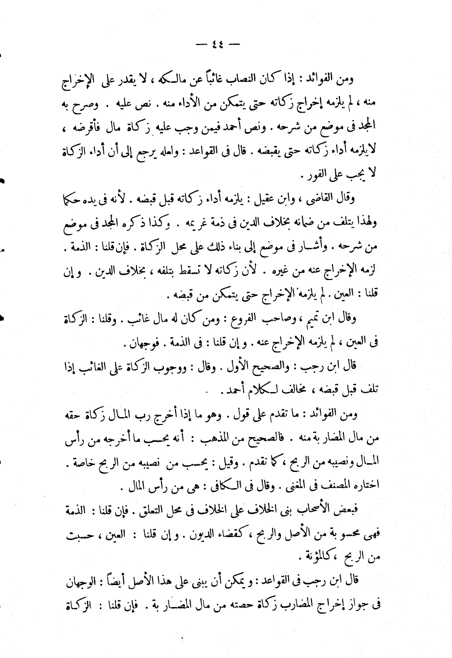 وَمِنْ الْفَوَائِدِ: إذَا كَانَ النِّصَابُ غَائِبًا عَنْ مَالِكِهِ، لَا يَقْدِرُ عَلَى الْإِخْرَاجِ مِنْهُ، لَمْ يَلْزَمْهُ إخْرَاجُ زَكَاتِهِ حَتَّى يَتَمَكَّنَ مِنْ الْأَدَاءِ مِنْهُ، نَصَّ عَلَيْهِ، وَصَرَّحَ بِهِ الْمَجْدُ فِي مَوْضِعٍ مِنْ شَرْحِهِ. وَنَصَّ أَحْمَدُ فِيمَنْ وَجَبَ عَلَيْهِ زَكَاةُ مَالٍ فَأَقْرَضَهُ، لَا يَلْزَمُهُ أَدَاءُ زَكَاتِهِ حَتَّى يَقْبِضَهُ، قَالَ فِي الْقَوَاعِدِ: وَلَعَلَّهُ يَرْجِعُ إلَى أَنَّ أَدَاءَ الزَّكَاةِ لَا يَجِبُ عَلَى الْفَوْرِ، وَقَالَ الْقَاضِي، وَابْنُ عَقِيلٍ: وَيَلْزَمُهُ أَدَاءُ زَكَاتِهِ قَبْلَ قَبْضِهِ؛ لِأَنَّهُ فِي يَدِهِ حُكْمًا وَلِهَذَا يَتْلَفُ مِنْ ضَمَانِهِ بِخِلَافِ الدَّيْنِ فِي ذِمَّةِ غَرِيمِهِ، وَكَذَا ذَكَرَهَا الْمَجْدُ فِي مَوْضِعٍ مِنْ شَرْحِهِ، وَأَشَارَ فِي مَوْضِعٍ إلَى بِنَاءِ ذَلِكَ عَلَى مَحَلِّ الزَّكَاةِ.