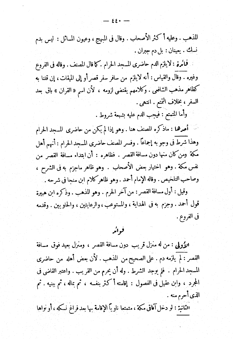فَائِدَةٌ: لَا يَلْزَمُ الدَّمُ حَاضِرِي الْمَسْجِدِ الْحَرَامِ. كَمَا قَالَ الْمُصَنِّفُ، وَقَالَهُ فِي الْفُرُوعِ وَغَيْرِهِ. وَقَالَ وَالْقِيَاسُ: أَنَّهُ لَا يَلْزَمُ مَنْ سَافَرَ سَفَرَ قَصْرٍ أَوْ إلَى الْمِيقَاتِ، إنْ قُلْنَا بِهِ كَظَاهِرِ مَذْهَبِ الشَّافِعِيِّ. وَكَلَامُهُمْ يَقْتَضِي لُزُومَهُ، لِأَنَّ اسْمَ " الْقِرَانِ " بَاقٍ بَعْدَ السَّفَرِ، بِخِلَافِ التَّمَتُّعِ. انْتَهَى.