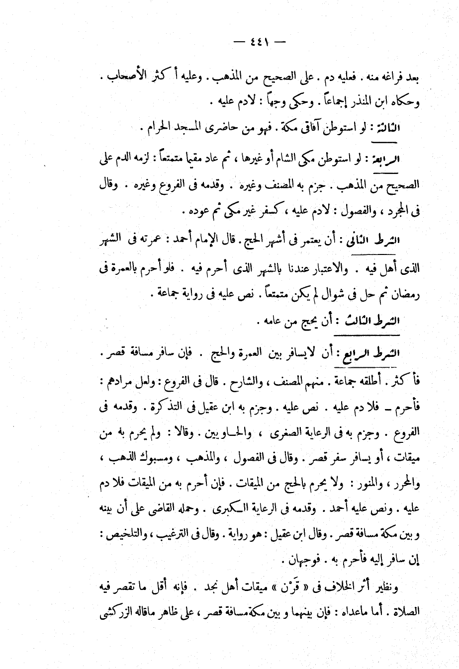 الشَّرْطِ الثَّانِي: أَنْ يَعْتَمِرَ فِي أَشْهُرِ الْحَجِّ. قَالَ الْإِمَامُ أَحْمَدُ: عُمْرَتُهُ فِي الشَّهْرِ الَّذِي أَهَلَّ فِيهِ. وَالِاعْتِبَارُ عِنْدَنَا بِالشَّهْرِ الَّذِي أَحْرَمَ فِيهِ، فَلَوْ أَحْرَمَ بِالْعُمْرَةِ فِي رَمَضَانَ ثُمَّ حَلَّ فِي شَوَّالٍ لَمْ يَكُنْ مُتَمَتِّعًا، نَصَّ عَلَيْهِ فِي رِوَايَةٍ جَمَاعَةٌ. الشَّرْطِ الثَّالِثِ: أَنْ يَحُجَّ مِنْ عَامِهِ. الشَّرْطِ الرَّابِعِ: أَنْ لَا يُسَافِرَ بَيْنَ الْعُمْرَةِ وَالْحَجِّ، فَإِنْ سَافَرَ مَسَافَةَ قَصْرٍ، فَأَكْثَرَ. أَطْلَقَهُ جَمَاعَةٌ. مِنْهُمْ الْمُصَنِّفُ، وَالشَّارِحُ. قَالَ فِي الْفُرُوعِ: وَلَعَلَّ مُرَادَهُمْ: فَأَحْرَمَ فَلَا دَمَ عَلَيْهِ، نَصَّ عَلَيْهِ، وَجَزَمَ بِهِ ابْنُ عَقِيلٍ فِي التَّذْكِرَةِ، وَقَدَّمَهُ فِي الْفُرُوعِ، وَجَزَمَ بِهِ فِي الرِّعَايَةِ الصُّغْرَى، وَالْحَاوِيَيْنِ، وَقَالَا: وَلَمْ يُحْرِمْ بِهِ مِنْ مِيقَاتٍ، أَوْ يُسَافِرُ سَفَرَ قَصْرٍ. وَقَالَ فِي الْفُصُولِ، وَالْمُذْهَبِ، وَمَسْبُوكِ الذَّهَبِ، وَالْمُحَرَّرِ، وَالْمُنَوِّرِ: وَلَا يُحْرِمُ بِالْحَجِّ مِنْ الْمِيقَاتِ، فَإِنْ أَحْرَمَ بِهِ مِنْ الْمِيقَاتِ فَلَا دَمَ عَلَيْهِ، وَنَصَّ عَلَيْهِ أَحْمَدُ، وَقَدَّمَهُ فِي الرِّعَايَةِ الْكُبْرَى، وَحَمَلَهُ الْقَاضِي عَلَى أَنَّ بَيْنَهُ وَبَيْنَ مَكَّةَ مَسَافَةَ قَصْرٍ، وَقَالَ ابْنُ عَقِيلٍ: هُوَ رِوَايَةٌ، وَقَالَ فِي التَّرْغِيبِ، وَالتَّلْخِيصِ: إنْ سَافَرَ إلَيْهِ فَأَحْرَمَ بِهِ، فَوَجْهَانِ، وَنَظِيرُ أَثَرِ الْخِلَافِ فِي " قَرْنٍ " مِيقَاتِ أَهْلِ نَجْدٍ، فَإِنَّهُ أَقَلُّ مَا تُقْصَرُ فِيهِ الصَّلَاةُ. أَمَّا مَا عَدَاهُ: فَإِنَّ بَيْنَهُمَا وَبَيْنَ مَكَّةَ مَسَافَةَ قَصْرٍ، عَلَى ظَاهِرِ مَا قَالَهُ الزَّرْكَشِيُّ