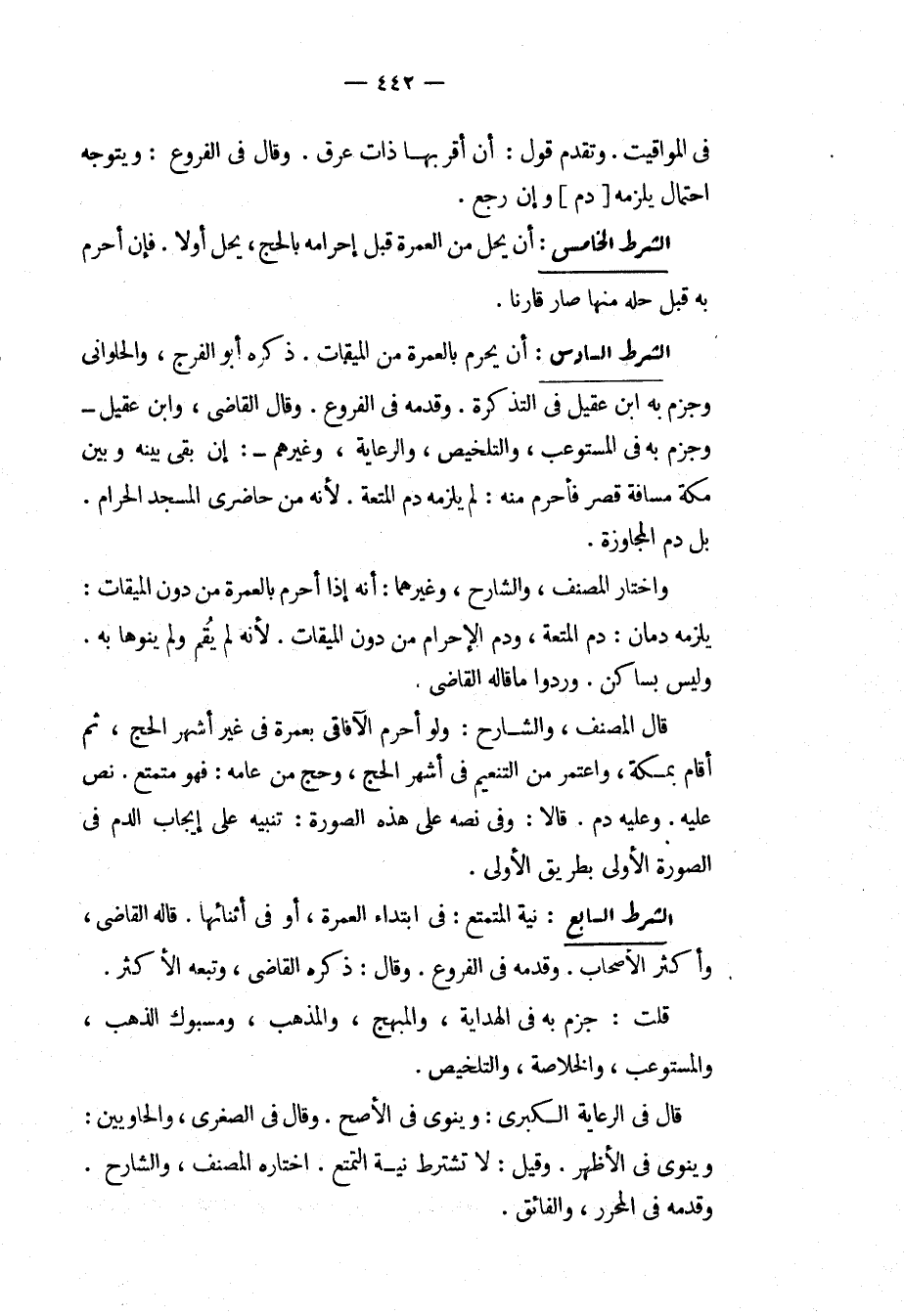 الشَّرْطِ السَّابِعِ: نِيَّةُ الْمُتَمَتِّعِ: فِي ابْتِدَاءِ الْعُمْرَةِ، أَوْ فِي أَثْنَائِهَا. قَالَهُ الْقَاضِي، وَأَكْثَرُ الْأَصْحَابِ، وَقَدَّمَهُ فِي الْفُرُوعِ. وَقَالَ: ذَكَرَهُ الْقَاضِي، وَتَبِعَهُ الْأَكْثَرُ.