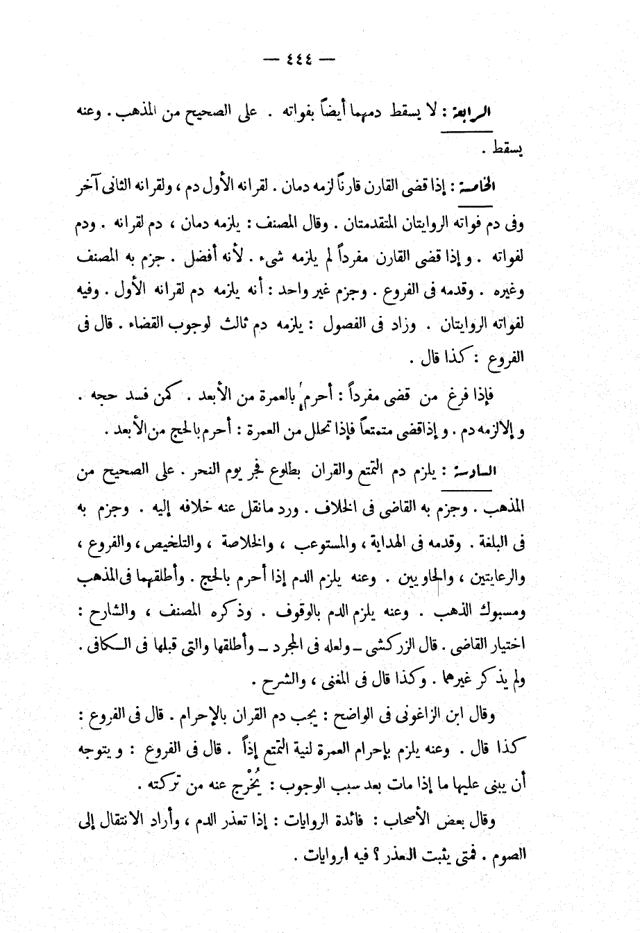 السَّادِسَةُ: يَلْزَمُ دَمُ التَّمَتُّعِ وَالْقِرَانِ بِطُلُوعِ فَجْرِ يَوْمِ النَّحْرِ عَلَى الصَّحِيحِ مِنْ الْمَذْهَبِ، وَجَزَمَ بِهِ الْقَاضِي فِي الْخِلَافِ، وَرَدَّ مَا نُقِلَ عَنْهُ خِلَافُهُ إلَيْهِ، وَجَزَمَ بِهِ فِي الْبُلْغَةِ، وَقَدَّمَهُ فِي الْهِدَايَةِ، وَالْمُسْتَوْعِبِ، وَالْخُلَاصَةِ، وَالتَّلْخِيصِ، وَالْفُرُوعِ، وَالرِّعَايَتَيْنِ، وَالْحَاوِيَيْنِ. وَعَنْهُ يَلْزَمُ الدَّمُ إذَا أَحْرَمَ بِالْحَجِّ، وَأَطْلَقَهُمَا فِي الْمُذْهَبِ وَمَسْبُوكِ الذَّهَبِ، وَعَنْهُ يَلْزَمُ الدَّمُ بِالْوُقُوفِ، وَذَكَرَهُ الْمُصَنِّفُ، وَالشَّارِحُ: اخْتِيَارُ الْقَاضِي. قَالَ الزَّرْكَشِيُّ وَلَعَلَّهُ فِي الْمُجَرَّدِ وَأَطْلَقَهَا وَاَلَّتِي قَبْلَهَا فِي الْكَافِي، وَلَمْ يَذْكُرْ غَيْرَهُمَا. كَذَا قَالَ فِي الْمُغْنِي، وَالشَّرْحِ، وَقَالَ ابْنُ الزَّاغُونِيُّ فِي الْوَاضِحِ: يَجِبُ دَمُ الْقِرَانِ بِالْإِحْرَامِ. قَالَ فِي الْفُرُوعِ: كَذَا قَالَ، وَعَنْهُ يَلْزَمُ إحْرَامُ الْعُمْرَةِ لِنِيَّةِ التَّمَتُّعِ إذَا قَالَ فِي الْفُرُوعِ: وَيَتَوَجَّهُ أَنْ يَبْنِيَ عَلَيْهَا مَا إذَا مَاتَ بَعْدَ سَبَبِ الْوُجُوبِ: يَخْرُجُ عَنْهُ مِنْ تَرِكَتِهِ، وَقَالَ بَعْضُ الْأَصْحَابِ: فَائِدَةُ الرِّوَايَاتِ: إذَا تَعَذَّرَ الدَّمُ، وَأَرَادَ الِانْتِقَالَ إلَى الصَّوْمِ، فَمَتَى يَثْبُتُ الْعُذْرُ؟ فِيهِ الرِّوَايَاتُ.