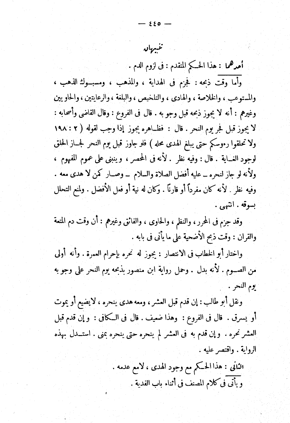 تَنْبِيهَانِ: أَحَدُهُمَا: هَذَا الْحُكْمُ الْمُتَقَدِّمُ: فِي لُزُومِ الدَّمِ، وَأَمَّا وَقْتُ ذَبْحِهِ: فَجَزَمَ فِي الْهِدَايَةِ، وَالْمُذْهَبِ، وَمَسْبُوكِ الذَّهَبِ، وَالْمُسْتَوْعِبِ، وَالْخُلَاصَةِ، وَالْهَادِي، وَالتَّلْخِيصِ، وَالْبُلْغَةِ، وَالرِّعَايَتَيْنِ، وَالْحَاوِيَيْنِ وَغَيْرِهِمْ: أَنَّهُ لَا يَجُوزُ ذَبْحُهُ قَبْلَ وُجُوبِهِ. قَالَ فِي الْفُرُوعِ: وَقَالَ الْقَاضِي وَأَصْحَابُهُ: لَا يَجُوزُ قَبْلَ فَجْرِ يَوْمِ النَّحْرِ. قَالَ: فَظَاهِرُهُ يَجُوزُ إذَا وَجَبَ لِقَوْلِهِ {وَلا تَحْلِقُوا رُءُوسَكُمْ حَتَّى يَبْلُغَ الْهَدْيُ مَحِلَّهُ} [البقرة: 196] فَلَوْ جَاوَزَ قَبْلَ يَوْمِ النَّحْرِ لَجَازَ الْحَلْقُ لِوُجُودِ الْغَايَةِ. قَالَ: وَفِيهِ نَظَرٌ؛ لِأَنَّهُ فِي الْمُحْصَرِ، وَيَنْبَنِي عَلَى عُمُومِ الْمَفْهُومِ؛ وَلِأَنَّهُ لَوْ جَازَ لَنَحَرَهُ عَلَيْهِ أَفْضَلُ الصَّلَاةِ وَالسَّلَامِ وَصَارَ كَمَنْ لَا هَدْيَ مَعَهُ. وَفِيهِ نَظَرٌ؛ لِأَنَّهُ كَانَ مُفْرِدًا أَوْ قَارِنًا، وَكَانَ لَهُ نِيَّةٌ أَوْ فَعَلَ الْأَفْضَلَ، وَلِمَنْعِ التَّحَلُّلِ بِسَوْقِهِ. انْتَهَى. وَقَدْ جَزَمَ فِي الْمُحَرَّرِ، وَالنَّظْمِ، وَالْحَاوِي، وَالْفَائِقِ وَغَيْرِهِمْ: أَنَّ وَقْتَ دَمِ الْمُتْعَةِ وَالْقِرَانِ: وَقْتُ ذَبْحِ الْأُضْحِيَّةِ عَلَى مَا يَأْتِي فِي بَابِهِ، وَاخْتَارَ أَبُو الْخَطَّابِ فِي الِانْتِصَارِ: يَجُوزُ لَهُ نَحْرُهُ بِإِحْرَامِ الْعُمْرَةِ، وَأَنَّهُ أَوْلَى مِنْ الصَّوْمِ؛ لِأَنَّهُ بَدَلٌ، وَحَمَلَ رِوَايَةَ ابْنِ مَنْصُورٍ بِذَبْحِهِ يَوْمَ النَّحْرِ عَلَى وُجُوبِهِ يَوْمَ النَّحْرِ، وَنَقَلَ أَبُو طَالِبٍ: إنْ قَدِمَ قَبْلَ الْعَشْرِ، وَمَعَهُ هَدْيٌ يَنْحَرُهُ، لَا يَضِيعُ أَوْ يَمُوتُ أَوْ يُسْرَقُ. قَالَ فِي الْفُرُوعِ: وَهَذَا ضَعِيفٌ. قَالَ فِي الْكَافِي: وَإِنْ قَدِمَ قَبْلَ الْعَشْرِ نَحَرَهُ، وَإِنْ قَدِمَ بِهِ فِي الْعَشْرِ لَمْ يَنْحَرْهُ حَتَّى يَنْحَرَهُ بِمِنًى. اسْتَدَلَّ بِهَذِهِ الرِّوَايَةِ، وَاقْتَصَرَ عَلَيْهِ. الثَّانِي: هَذَا الْحُكْمُ مَعَ وُجُودِ الْهَدْيِ، لَا مَعَ عَدَمِهِ، وَيَأْتِي فِي كَلَامِ الْمُصَنِّفِ فِي أَثْنَاءِ بَابِ الْفِدْيَةِ.