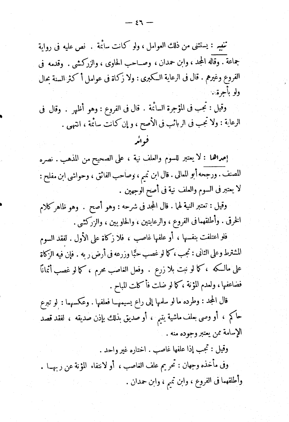 فَوَائِدُ: إحْدَاهَا: لَا يُعْتَبَرُ لِلسَّوْمِ وَالْعَلَفِ نِيَّةٌ، عَلَى الصَّحِيحِ مِنْ الْمَذْهَبِ نَصَرَهُ الْمُصَنِّفُ، وَرَجَّحَهُ أَبُو الْمَعَالِي، قَالَ ابْنُ تَمِيمٍ، وَصَاحِبُ الْفَائِقِ، وَحَوَاشِي ابْنِ مُفْلِحٍ: لَا يُعْتَبَرُ فِي السَّوْمِ وَالْعَلَفِ نِيَّةٌ فِي أَصَحِّ الْوَجْهَيْنِ، وَقِيلَ: تُعْتَبَرُ النِّيَّةُ لَهُمَا، قَالَ الْمَجْدُ فِي شَرْحِهِ: وَهُوَ أَصَحُّ، وَهُوَ ظَاهِرُ كَلَامِ الْخِرَقِيِّ.