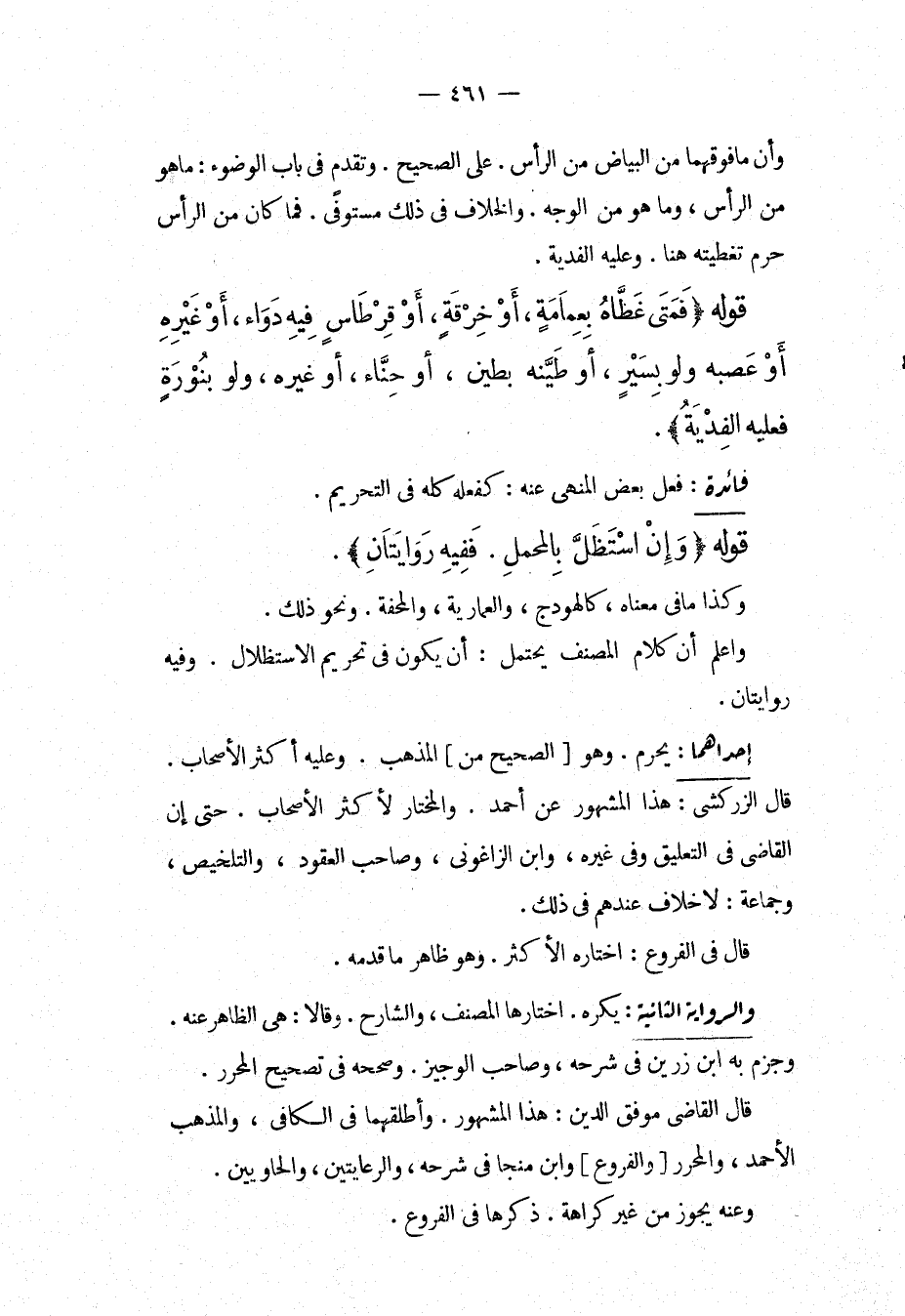فَائِدَةٌ فِعْلُ بَعْضِ الْمَنْهِيِّ عَنْهُ كَفِعْلِهِ كُلِّهِ فِي التَّحْرِيمِ. قَوْلُهُ (وَإِنْ اسْتَظَلَّ بِالْمَحْمَلِ، فَفِيهِ رِوَايَتَانِ) ، وَكَذَا مَا فِي مَعْنَاهُ، كَالْهَوْدَجِ، وَالْعِمَادِيَّةِ، وَالْمِحَفَّةِ، وَنَحْوِ ذَلِكَ، وَاعْلَمْ أَنَّ كَلَامَ الْمُصَنِّفِ يَحْتَمِلُ: أَنْ يَكُونَ فِي تَحْرِيمِ الِاسْتِظْلَالِ. وَفِيهِ رِوَايَتَانِ. . إحْدَاهُمَا: يَحْرُمُ، وَهُوَ [الصَّحِيحُ مِنْ] الْمَذْهَبِ، وَعَلَيْهِ أَكْثَرُ الْأَصْحَابِ. قَالَ الزَّرْكَشِيُّ: هَذَا الْمَشْهُورُ عَنْ أَحْمَدَ، وَالْمُخْتَارُ لِأَكْثَرِ الْأَصْحَابِ. حَتَّى إنَّ الْقَاضِيَ فِي التَّعْلِيقِ وَفِي غَيْرِهِ، وَابْنَ الزَّاغُونِيِّ، وَصَاحِبَ الْعُقُودِ، وَالتَّلْخِيصِ، وَجَمَاعَةً: لَا خِلَافَ عِنْدَهُمْ فِي ذَلِكَ. قَالَ فِي الْفُرُوعِ: اخْتَارَهُ الْأَكْثَرُ، وَهُوَ ظَاهِرُ مَا قَدَّمَهُ، وَالرَّاوِيَةُ الثَّانِيَةُ: يُكْرَهُ، اخْتَارَهَا الْمُصَنِّفُ، وَالشَّارِحُ، وَقَالَا: هِيَ الظَّاهِرُ عَنْهُ، وَجَزَمَ بِهِ ابْنُ رَزِينٍ فِي شَرْحِهِ، وَصَاحِبُ الْوَجِيزِ. وَصَحَّحَهُ فِي تَصْحِيحِ الْمُحَرَّرِ. قَالَ الْقَاضِي مُوَفَّقُ الدِّينِ: هَذَا الْمَشْهُورُ، وَأَطْلَقَهُمَا فِي الْكَافِي، وَالْمَذْهَبِ الْأَحْمَدِ، وَالْمُحَرَّرِ [وَالْفُرُوعِ] وَابْنُ مُنَجَّى فِي شَرْحِهِ، وَالرِّعَايَتَيْنِ، وَالْحَاوِيَيْنِ، وَعَنْهُ يَجُوزُ مِنْ غَيْرِ كَرَاهَةٍ. ذَكَرَهَا فِي الْفُرُوعِ.