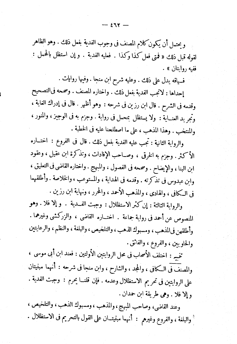 وَيُحْتَمَلُ أَنْ يَكُونَ كَلَامُ الْمُصَنِّفِ فِي وُجُوبِ الْفِدْيَةِ بِفِعْلِ ذَلِكَ، وَهُوَ الظَّاهِرُ لِقَوْلِهِ قَبْلَ ذَلِكَ " فَمَتَى فَعَلَ كَذَا كَذَا، فَعَلَيْهِ الْفِدْيَةُ، وَإِنْ اسْتَظَلَّ بِالْمَحْمَلِ: فَفِيهِ رِوَايَتَانِ ". فَسِيَاقُهُ يَدُلُّ عَلَى ذَلِكَ، وَعَلَيْهِ شَرْحُ ابْنِ مُنَجَّى، وَفِيهَا رِوَايَاتٌ. إحْدَاهَا: لَا تَجِبُ الْفِدْيَةُ بِفِعْلِ ذَلِكَ، وَاخْتَارَهُ الْمُصَنِّفُ، وَصَحَّحَهُ فِي التَّصْحِيحِ وَقَدَّمَهُ فِي الشَّرْحِ. قَالَ ابْنُ رَزِينٍ فِي شَرْحِهِ: وَهُوَ أَظْهَرُ. قَالَ فِي إدْرَاكِ الْغَايَةِ، وَتَجْرِيدِ الْعِنَايَةِ: وَلَا يَسْتَظِلُّ بِمَحْمَلٍ فِي رِوَايَةٍ، وَجَزَمَ بِهِ فِي الْوَجِيزِ، وَالْمُنَوِّرِ، وَالْمُنْتَخَبِ، وَهَذَا الْمَذْهَبُ، عَلَى مَا اصْطَلَحْنَا عَلَيْهِ فِي الْخُطْبَةِ. وَالرِّوَايَةُ الثَّانِيَةُ: تَجِبُ عَلَيْهِ الْفِدْيَةُ بِفِعْلِ ذَلِكَ. قَالَ فِي الْفُرُوعِ: اخْتَارَهُ الْأَكْثَرُ، وَجَزَمَ بِهِ الْخِرَقِيُّ، وَصَاحِبُ الْإِفَادَاتِ، وَتَذْكِرَةُ ابْنِ عَقِيلٍ، وَعُقُودُ ابْنِ الْبَنَّا، وَالْإِيضَاحُ. وَصَحَّحَهُ فِي الْفُصُولِ. وَالْمُبْهِجِ، وَاخْتَارَهُ الْقَاضِي فِي التَّعْلِيقِ، وَابْنُ عَبْدُوسٍ فِي تَذْكِرَتِهِ، وَقَدَّمَهُ فِي الْهِدَايَةِ، وَالْمُسْتَوْعِبِ، وَالْخُلَاصَةِ، وَأَطْلَقَهُمَا فِي الْكَافِي، وَالْهَادِي، وَالْمَذْهَبِ الْأَحْمَدِ، وَالْمُحَرَّرِ، وَنِهَايَةِ ابْنِ رَزِينٍ. وَالرِّوَايَةُ الثَّالِثَةُ: إنْ كَثُرَ الِاسْتِظْلَالُ: وَجَبَتْ الْفِدْيَةُ، وَإِلَّا فَلَا، وَهُوَ الْمَنْصُوصُ عَنْ أَحْمَدَ فِي رِوَايَةِ جَمَاعَةٍ، اخْتَارَهُ الْقَاضِي، وَالزَّرْكَشِيُّ وَغَيْرُهُمَا. وَأَطْلَقَهُنَّ فِي الْمُذْهَبِ، وَمَسْبُوكِ الذَّهَبِ، وَالتَّلْخِيصِ، وَالْبُلْغَةِ، وَالنَّظْمِ، وَالرِّعَايَتَيْنِ وَالْحَاوِيَيْنِ، وَالْفُرُوعِ، وَالْفَائِقِ.