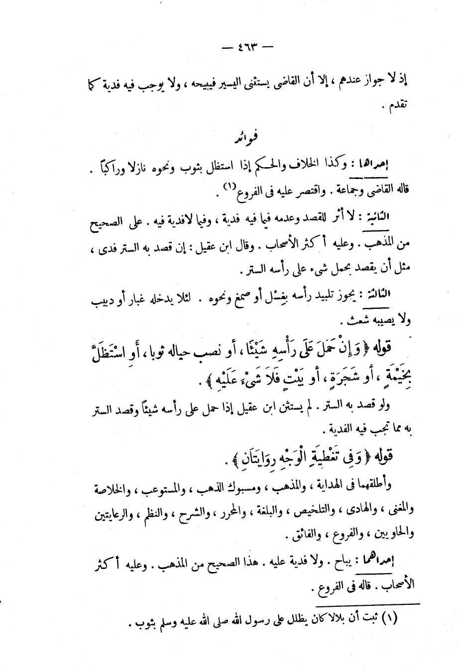 فَوَائِدُ. إحْدَاهَا: وَكَذَا الْخِلَافُ وَالْحُكْمُ إذَا اسْتَظَلَّ بِثَوْبٍ وَنَحْوِهِ نَازِلًا وَرَاكِبًا. قَالَهُ الْقَاضِي وَجَمَاعَةٌ، وَاقْتَصَرَ عَلَيْهِ فِي الْفُرُوعِ.