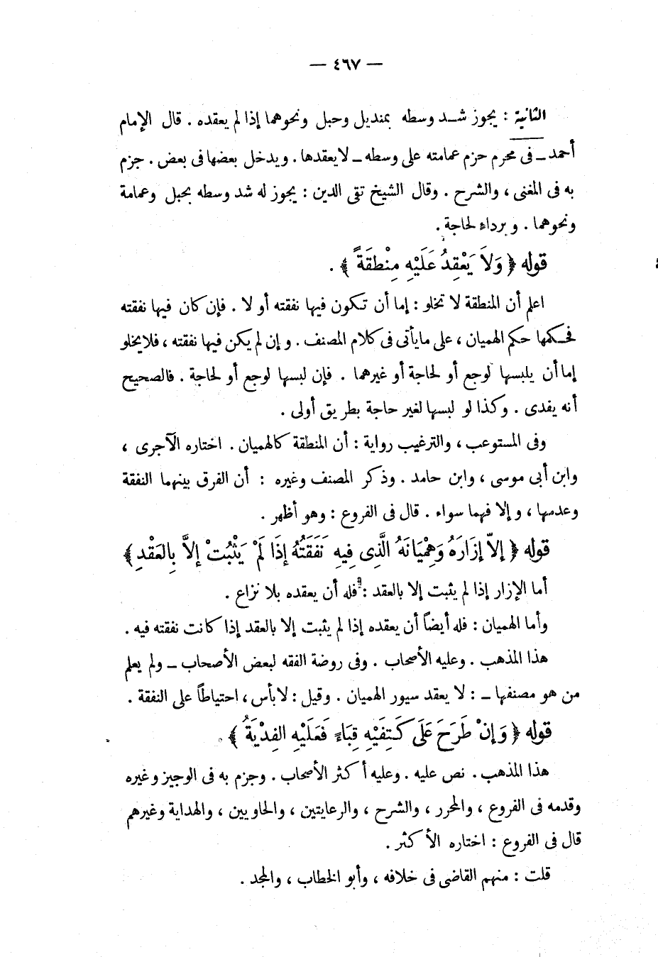 قَوْلُهُ (وَلَا يَعْقِدَ عَلَيْهِ مِنْطَقَةً) . اعْلَمْ أَنَّ الْمِنْطَقَةَ لَا تَخْلُو: إمَّا أَنْ تَكُونَ فِيهَا نَفَقَتُهُ أَوْ لَا، فَإِنْ كَانَ فِيهَا نَفَقَتُهُ فَحُكْمُهَا حُكْمُ الْهِمْيَانِ، عَلَى مَا يَأْتِي فِي كَلَامِ الْمُصَنِّفِ، وَإِنْ لَمْ يَكُنْ فِيهَا نَفَقَتُهُ، فَلَا يَخْلُو إمَّا أَنْ يَلْبَسَهَا لِوَجَعٍ أَوْ لِحَاجَةٍ أَوْ غَيْرِهِمَا، فَإِنْ لَبِسَهَا لِوَجَعٍ أَوْ لِحَاجَةٍ، فَالصَّحِيحُ أَنَّهُ يَفْدِي، وَكَذَا لَوْ لَبِسَهَا لِغَيْرِ حَاجَةٍ بِطَرِيقِ أَوْلَى، وَفِي الْمُسْتَوْعِبِ، وَالتَّرْغِيبِ رِوَايَةٌ: أَنَّ الْمِنْطَقَةَ كَالْهِمْيَانِ، اخْتَارَهُ الْآجُرِّيُّ، وَابْنُ أَبِي مُوسَى، وَابْنُ حَامِدٍ، وَذَكَرَ الْمُصَنِّفُ وَغَيْرُهُ: أَنَّ الْفَرْقَ بَيْنَهُمَا النَّفَقَةُ وَعَدَمُهَا، وَإِلَّا فَهُمَا سَوَاءٌ. قَالَ فِي الْفُرُوعِ: وَهُوَ أَظْهَرُ. قَوْلُهُ (إلَّا إزَارَهُ وَهِمْيَانَهُ الَّذِي فِيهِ نَفَقَتُهُ إذَا لَمْ يَثْبُتْ إلَّا بِالْعَقْدِ) أَمَّا الْإِزَارُ إذَا لَمْ يَثْبُتْ إلَّا بِالْعَقْدِ: فَلَهُ أَنْ يَعْقِدَهُ بِلَا نِزَاعٍ، وَأَمَّا الْهِمْيَانُ: فَلَهُ أَيْضًا أَنْ يَعْقِدَهُ إذَا لَمْ يَثْبُتْ إلَّا بِالْعَقْدِ إذَا كَانَتْ نَفَقَتُهُ فِيهِ. هَذَا الْمَذْهَبُ، وَعَلَيْهِ الْأَصْحَابُ، وَفِي رَوْضَةِ الْفِقْهِ لِبَعْضِ الْأَصْحَابِ وَلَمْ يُعْلَمْ مَنْ هُوَ مُصَنِّفُهَا: لَا يَعْقِدُ سُيُورَ الْهِمْيَانِ. وَقِيلَ: لَا بَأْسَ، احْتِيَاطًا عَلَى النَّفَقَةِ.