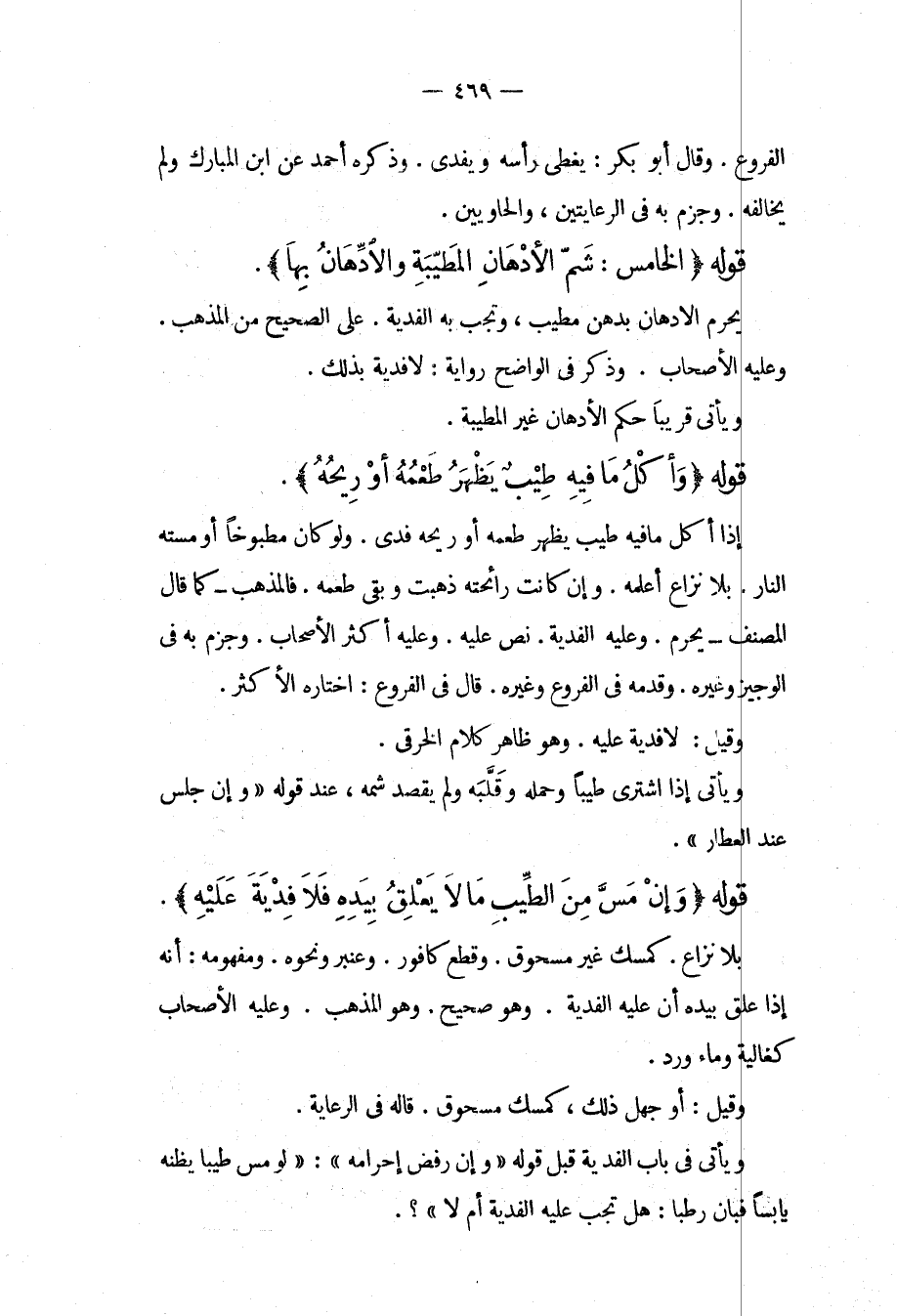 قَوْلُهُ (الْخَامِسُ: شَمُّ الْأَدْهَانِ الْمُطَيِّبَةِ وَالِادِّهَانُ بِهَا) . يَحْرُمُ الِادِّهَانُ بِدُهْنٍ مُطَيِّبٍ، وَتَجِبُ بِهِ الْفِدْيَةُ عَلَى الصَّحِيحِ مِنْ الْمَذْهَبِ، وَعَلَيْهِ الْأَصْحَابُ، وَذَكَرَ فِي الْوَاضِحِ رِوَايَةً: لَا فِدْيَةَ بِذَلِكَ. وَيَأْتِي قَرِيبًا حُكْمُ الْأَدْهَانِ غَيْرِ الْمُطَيِّبَةِ.