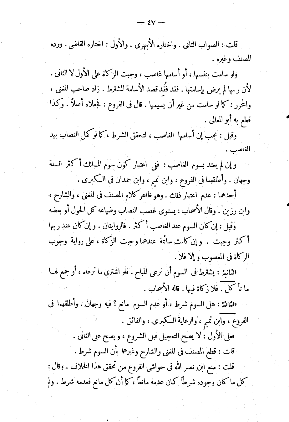 أَحَدُهُمَا: عَدَمُ اعْتِبَارِ ذَلِكَ، وَهُوَ ظَاهِرُ كَلَامِ الْمُصَنِّفِ فِي الْمُغْنِي، وَالشَّارِحِ، وَابْنُ رَزِينٍ، وَقَالَ الْأَصْحَابُ: يَسْتَوِي غَصْبُ النِّصَابِ وَضَيَاعُهُ كُلَّ الْحَوْلِ أَوْ بَعْضَهُ وَقِيلَ: إنْ كَانَ السَّوْمُ عِنْدَ الْغَاصِبِ أَكْثَرَ، فَالرِّوَايَتَانِ، وَإِنْ كَانَ عِنْدَ رَبِّهَا أَكْثَرَ وَجَبَتْ، وَإِنْ كَانَتْ سَائِمَةً عِنْدَهُمَا وَجَبَتْ الزَّكَاةُ، عَلَى رِوَايَةِ وُجُوبِ الزَّكَاةِ فِي الْمَغْصُوبِ وَإِلَّا فَلَا. الثَّانِيَةُ: يُشْتَرَطُ فِي السَّوْمِ أَنْ تَرْعَى الْمُبَاحَ، فَلَوْ اشْتَرَى مَا تَرْعَاهُ، أَوْ جَمَعَ لَهَا مَا تَأْكُلُ، فَلَا زَكَاةَ فِيهَا، قَالَهُ الْأَصْحَابُ. الثَّالِثَةُ: هَلْ السَّوْمُ شَرْطٌ، أَوْ عَدَمُ السَّوْمِ مَانِعٌ؟ فِيهِ وَجْهَانِ، وَأَطْلَقَهَا فِي الْفُرُوعِ، وَابْنُ تَمِيمٍ. وَالرِّعَايَةِ الْكُبْرَى، وَالْفَائِقِ، فَعَلَى الْأَوَّلِ: لَا يَصِحُّ التَّعْجِيلُ قَبْلَ الشُّرُوعِ، وَيَصِحُّ عَلَى الثَّانِي، قُلْت: قَطَعَ الْمُصَنِّفُ فِي الْمُغْنِي وَالشَّارِحُ وَغَيْرِهِمَا بِأَنَّ السَّوْمَ شَرْطٌ، قُلْت: مَنَعَ ابْنُ نَصْرِ اللَّهِ فِي حَوَاشِي الْفُرُوعِ مِنْ تَحَقُّقِ هَذَا الْخِلَافِ، وَقَالَ: كُلُّ مَا كَانَ وُجُودُهُ شَرْطًا كَانَ عَدَمُهُ مَانِعًا، كَمَا أَنَّ كُلَّ مَانِعٍ فَعَدَمُهُ شَرْطٌ، وَلَمْ