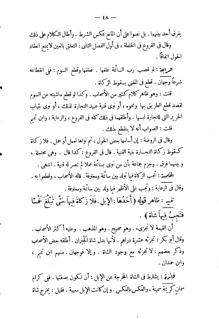 تَنْبِيهٌ: ظَاهِرُ قَوْلِهِ (أَحَدُهَا: الْإِبِلُ، فَلَا زَكَاةَ فِيهَا حَتَّى تَبْلُغَ خَمْسًا فَتَجِبُ فِيهَا شَاةٌ) .