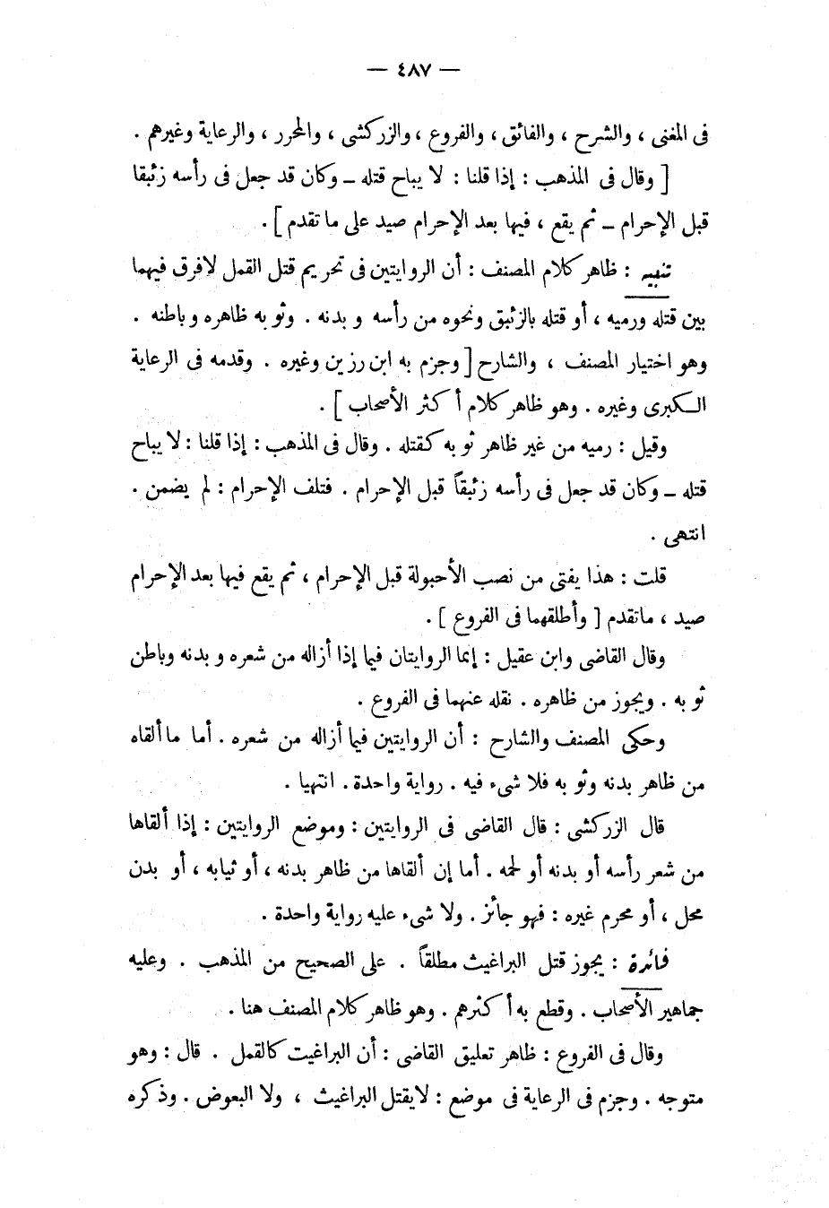 فِي الْمُغْنِي، وَالشَّرْحِ، وَالْفَائِقِ، وَالْفُرُوعِ، وَالزَّرْكَشِيِّ، وَالْمُحَرَّرِ، وَالرِّعَايَةِ وَغَيْرِهِمْ. [وَقَالَ فِي الْمَذْهَبِ: إذَا قُلْنَا: لَا يُبَاحُ قَتْلُهُ وَكَانَ قَدْ جَعَلَ فِي رَأْسِهِ زِئْبَقًا قَبْلَ الْإِحْرَامِ ثُمَّ يَقَعُ، فِيهَا بَعْدَ الْإِحْرَامِ صَيْدٌ عَلَى مَا تَقَدَّمَ] .