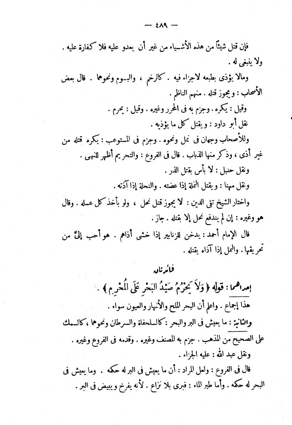 فَائِدَتَانِ. إحْدَاهُمَا: قَوْلُهُ (وَلَا يَحْرُمُ صَيْدُ الْبَحْرِ عَلَى الْمُحْرِمِ) . هَذَا إجْمَاعٌ. وَاعْلَمْ أَنَّ الْبَحْرَ الْمِلْحَ وَالْأَنْهَارَ وَالْعُيُونَ سَوَاءٌ، وَالثَّانِيَةُ: مَا يَعِيشُ فِي الْبَرِّ وَالْبَحْرِ: كَالسُّلَحْفَاةِ وَالسَّرَطَانِ وَنَحْوِهِمَا كَالسَّمَكِ عَلَى الصَّحِيحِ مِنْ الْمَذْهَبِ. جَزَمَ بِهِ الْمُصَنِّفُ وَغَيْرُهُ، وَقَدَّمَهُ فِي الْفُرُوعِ وَغَيْرِهِ، وَنَقَلَ عَبْدُ اللَّهِ: عَلَيْهِ الْجَزَاءُ، قَالَ فِي الْفُرُوعِ: وَلَعَلَّ الْمُرَادَ: أَنَّ مَا يَعِيشُ فِي الْبَرِّ لَهُ حُكْمُهُ، وَمَا يَعِيشُ فِي الْبَحْرِ لَهُ حُكْمُهُ، وَأَمَّا طَيْرُ الْمَاءِ: فَبَرِّيٌّ بِلَا نِزَاعٍ؛ لِأَنَّهُ يُفَرِّخُ وَيَبِيضُ فِي الْبَرِّ.