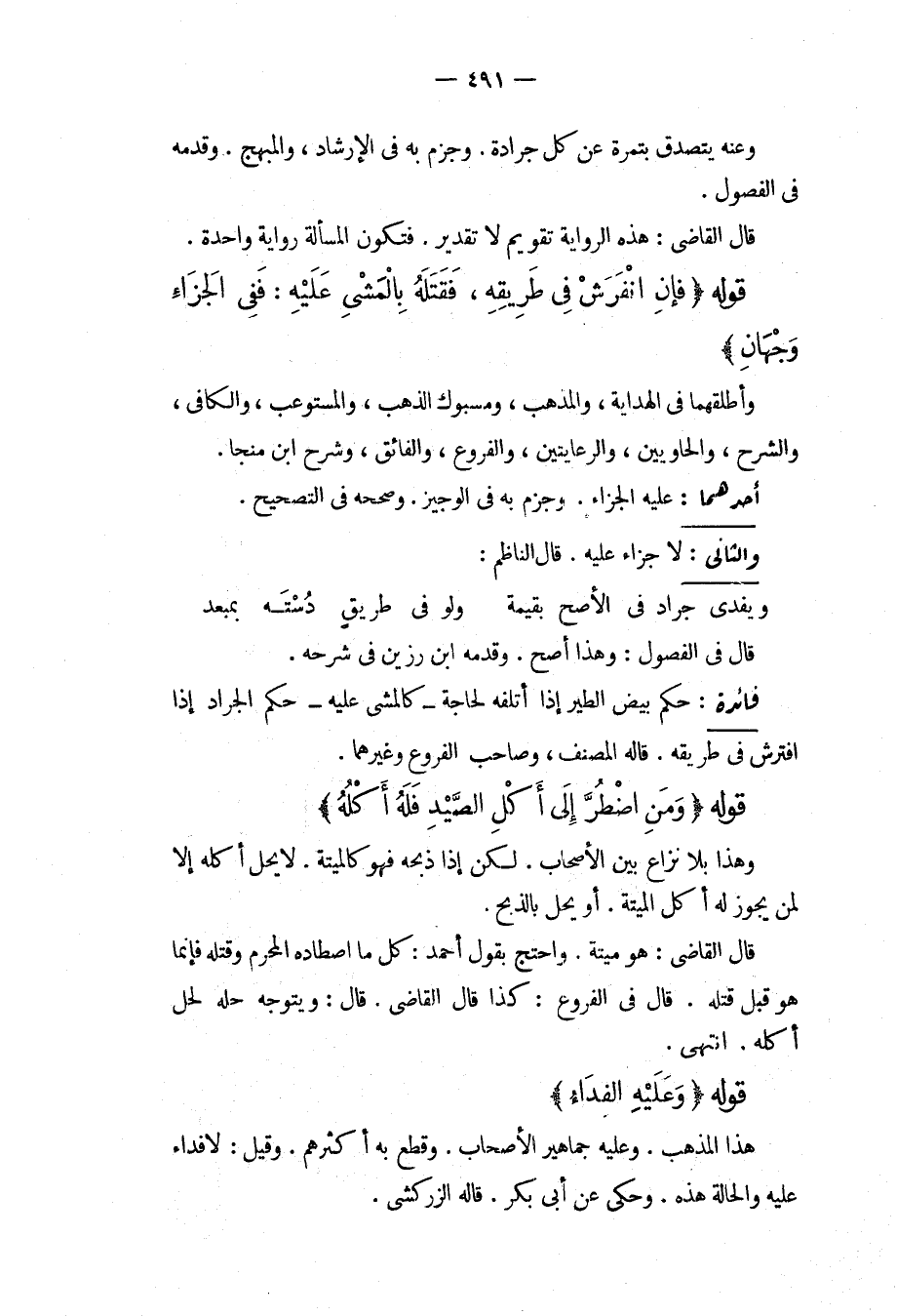 قَوْلُهُ (فَإِنْ انْفَرَشَ فِي طَرِيقِهِ، فَقَتَلَهُ بِالْمَشْيِ عَلَيْهِ: فَفِي الْجَزَاءِ وَجْهَانِ) وَأَطْلَقَهُمَا فِي الْهِدَايَةِ، وَالْمُذْهَبِ، وَمَسْبُوكِ الذَّهَبِ، وَالْمُسْتَوْعِبِ، وَالْكَافِي، وَالشَّرْحِ، وَالْحَاوِيَيْنِ، وَالرِّعَايَتَيْنِ، وَالْفُرُوعِ، وَالْفَائِقِ، وَشَرْحِ ابْنِ مُنَجَّى. أَحَدُهُمَا: عَلَيْهِ الْجَزَاءُ، وَجَزَمَ بِهِ فِي الْوَجِيزِ، وَصَحَّحَهُ فِي التَّصْحِيحِ، وَالثَّانِي: لَا جَزَاءَ عَلَيْهِ. قَالَ النَّاظِمُ: وَيُفْدَى جَرَادٌ فِي الْأَصَحِّ بِقِيمَةٍ وَلَوْ فِي طَرِيقٍ دُسْتَهُ بِمُبْعَدٍ قَالَ فِي الْفُصُولِ: وَهَذَا أَصَحُّ، وَقَدَّمَهُ ابْنُ رَزِينٍ فِي شَرْحِهِ.