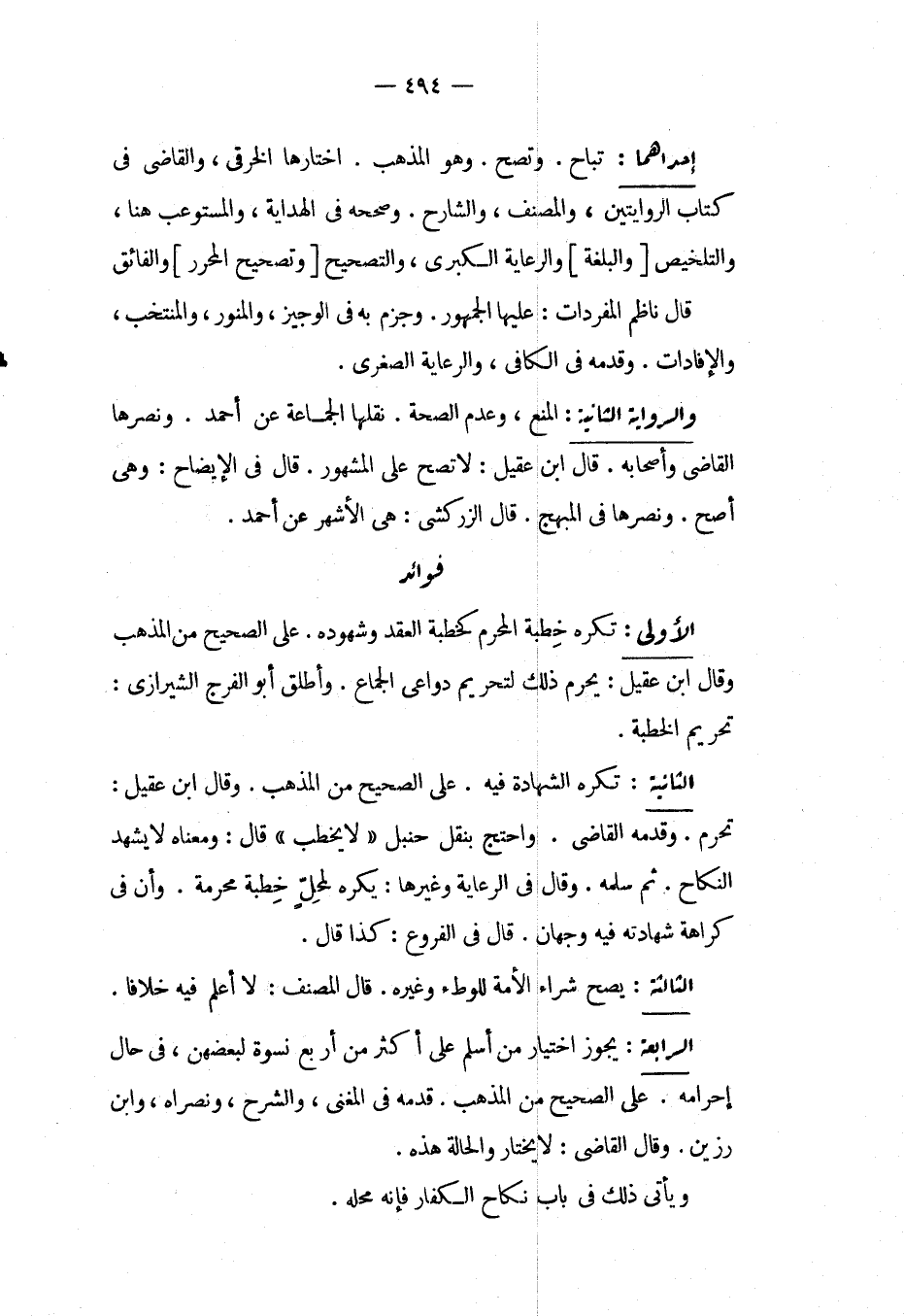 فَوَائِدُ. الْأُولَى: تُكْرَهُ خِطْبَةُ الْمُحْرِمِ كَخِطْبَةِ الْعَقْدِ وَشُهُودِهِ عَلَى الصَّحِيحِ مِنْ الْمَذْهَبِ وَقَالَ ابْنُ عَقِيلٍ: يَحْرُمُ ذَلِكَ لِتَحْرِيمِ دَوَاعِي الْجِمَاعِ، وَأَطْلَقَ أَبُو الْفَرَجِ الشِّيرَازِيُّ: تَحْرِيمَ الْخِطْبَةِ. الثَّانِيَةُ: تُكْرَهُ الشَّهَادَةُ فِيهِ عَلَى الصَّحِيحِ مِنْ الْمَذْهَبِ، وَقَالَ ابْنُ عَقِيلٍ: تَحْرُمُ، وَقَدَّمَهُ الْقَاضِي، وَاحْتَجَّ بِنَقْلِ حَنْبَلٍ " لَا يَخْطُبُ " قَالَ: وَمَعْنَاهُ لَا يَشْهَدُ النِّكَاحَ. ثُمَّ سَلَّمَهُ، وَقَالَ فِي الرِّعَايَةِ وَغَيْرِهَا: يُكْرَهُ لِمُحِلٍّ خِطْبَةُ مُحْرِمَةٍ. وَإِنَّ فِي كَرَاهَةِ شَهَادَتِهِ فِيهِ وَجْهَيْنِ. قَالَ فِي الْفُرُوعِ: كَذَا قَالَ.