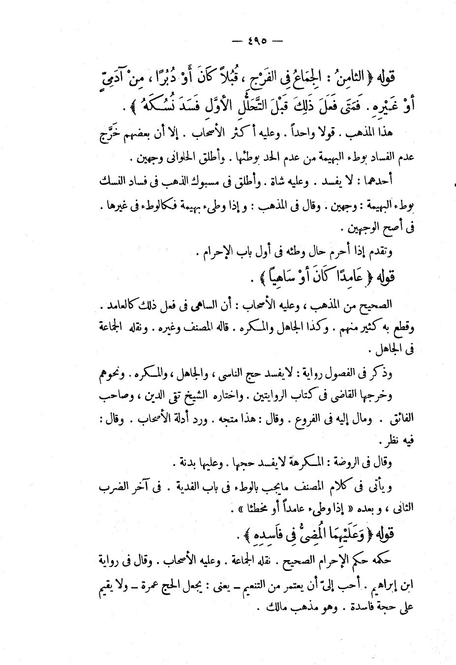 قَوْلُهُ (عَامِدًا كَانَ أَوْ سَاهِيًا) ، الصَّحِيحُ مِنْ الْمَذْهَبِ، وَعَلَيْهِ الْأَصْحَابُ: أَنَّ السَّاهِيَ فِي فِعْلِ ذَلِكَ كَالْعَامِدِ، وَقَطَعَ بِهِ كَثِيرٌ مِنْهُمْ. كَذَا الْجَاهِلُ وَالْمُكْرَهُ. قَالَهُ الْمُصَنِّفُ وَغَيْرُهُ، وَنَقَلَهُ الْجَمَاعَةُ فِي الْجَاهِلِ. وَذَكَرَ فِي الْفُصُولِ رِوَايَةً: لَا يَفْسُدُ حَجُّ النَّاسِي، وَالْجَاهِلِ، وَالْمُكْرَهِ، وَنَحْوِهِمْ وَخَرَّجَهَا الْقَاضِي فِي كِتَابِ الرِّوَايَتَيْنِ، وَاخْتَارَهُ الشَّيْخُ تَقِيُّ الدِّينِ، وَصَاحِبُ الْفَائِقِ. وَمَالَ إلَيْهِ فِي الْفُرُوعِ، وَقَالَ: هَذَا مُتَّجَهٌ، وَرَدَّ أَدِلَّةَ الْأَصْحَابِ، وَقَالَ: فِيهِ نَظَرٌ. وَقَالَ فِي الرَّوْضَةِ: الْمُكْرَهَةُ لَا يَفْسُدُ حَجُّهَا، وَعَلَيْهَا بَدَنَةٌ. وَيَأْتِي فِي كَلَامِ الْمُصَنِّفِ مَا يَجِبُ بِالْوَطْءِ فِي بَابِ الْفِدْيَةِ، فِي آخِرِ الضَّرْبِ الثَّانِي، وَبَعْدَهُ " إذَا وَطِئَ عَامِدًا أَوْ مُخْطِئًا ".