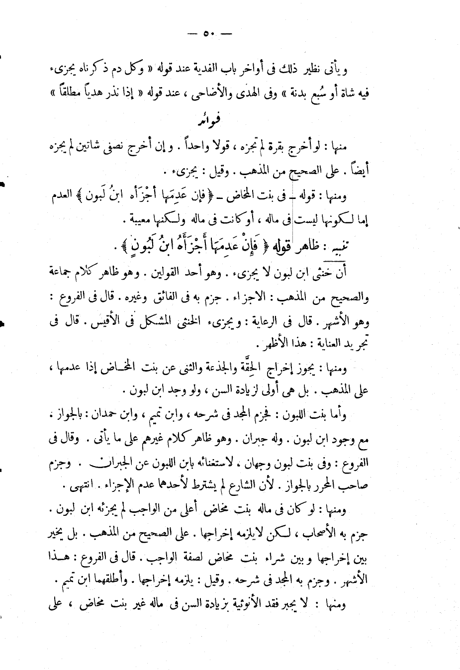 تَنْبِيهٌ: ظَاهِرُ قَوْلِهِ {فَإِنْ عَدِمَهَا أَجْزَأَهُ ابْنُ لَبُونٍ} أَنَّ خُنْثَى ابْنِ لَبُونٍ لَا يُجْزِئُ، وَهُوَ أَحَدُ الْقَوْلَيْنِ، وَهُوَ ظَاهِرُ كَلَامِ جَمَاعَةٍ وَالصَّحِيحُ مِنْ الْمَذْهَبِ: الْإِجْزَاءُ، جَزَمَ بِهِ فِي الْفَائِقِ وَغَيْرِهِ، قَالَ فِي الْفُرُوعِ: وَهُوَ الْأَشْهَرُ، قَالَ فِي الرِّعَايَةِ: وَيُجْزِئُ الْخُنْثَى الْمُشْكِلُ فِي الْأَقْيَسِ. قَالَ فِي تَجْرِيدِ الْعِنَايَةِ: هَذَا الْأَظْهَرُ، وَمِنْهَا: يَجُوزُ إخْرَاجُ الْحِقَّةِ وَالْجَذَعَةِ وَالثَّنِيُّ عَنْ بِنْتِ الْمَخَاضِ إذَا عَدِمَهَا، عَلَى الْمَذْهَبِ بَلْ هِيَ أَوْلَى لِزِيَادَةِ السِّنِّ، وَلَوْ وُجِدَ ابْنُ لَبُونٍ، وَأَمَّا بِنْتُ اللَّبُونِ: فَجَزَمَ الْمَجْدُ فِي شَرْحِهِ، وَابْنُ تَمِيمٍ، وَابْنُ حَمْدَانَ: بِالْجَوَازِ، مَعَ وُجُودِ ابْنِ لَبُونٍ، وَلَهُ جِيرَانٌ، وَهُوَ ظَاهِرُ كَلَامِ غَيْرِهِمْ عَلَى مَا يَأْتِي، وَقَالَ فِي الْفُرُوعِ: وَفِي بِنْتِ لَبُونٍ وَجْهَانِ؛ لِاسْتِغْنَائِهِ بِابْنِ اللَّبُونِ عَنْ الْجِيرَانِ، وَجَزَمَ صَاحِبُ الْمُحَرَّرِ بِالْجَوَازِ؛ لِأَنَّ الشَّارِعَ لَمْ يَشْتَرِطْ لِأَحَدِهِمَا عَدَمَ الْإِجْزَاءِ. انْتَهَى. وَمِنْهَا: لَوْ كَانَ فِي مَالِهِ بِنْتُ مَخَاضٍ أَعْلَى مِنْ الْوَاجِبِ لَمْ يُجْزِئْهُ ابْنُ لَبُونٍ جَزَمَ بِهِ الْأَصْحَابُ، لَكِنْ لَا يَلْزَمُهُ إخْرَاجُهَا عَلَى الصَّحِيحِ مِنْ الْمَذْهَبِ بَلْ يُخَيَّرُ بَيْنَ إخْرَاجِهَا وَبَيْنِ شِرَاءِ بِنْتِ مَخَاضٍ لِصِفَةِ الْوَاجِبِ، قَالَ فِي الْفُرُوعِ: هَذَا الْأَشْهَرُ، وَجَزَمَ بِهِ الْمَجْدُ فِي شَرْحِهِ، وَقِيلَ: يَلْزَمُهُ إخْرَاجُهَا، وَأَطْلَقَهُمَا ابْنُ تَمِيمٍ، وَمِنْهَا: لَا يَجْبُرُ فَقْدَ الْأُنُوثِيَّةِ بِزِيَادَةِ السِّنِّ فِي مَالِهِ غَيْرُ بِنْتِ مَخَاضٍ، عَلَى