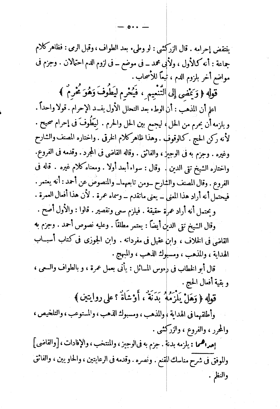 قَوْلُهُ (وَيَمْضِي إلَى التَّنْعِيمِ، فَيُحْرِمُ لِيَطُوفَ وَهُوَ مُحْرِمٌ) اعْلَمْ أَنَّ الْمَذْهَبَ: أَنَّ الْوَطْءَ بَعْدَ التَّحَلُّلِ الْأَوَّلِ يُفْسِدُ الْإِحْرَامَ. قَوْلًا وَاحِدًا، وَيَلْزَمُهُ أَنْ يُحْرِمَ مِنْ الْحِلِّ، لِيَجْمَعَ بَيْنَ الْحِلِّ وَالْحَرَمِ؛ لِيَطُوفَ فِي إحْرَامٍ صَحِيحٍ؛ لِأَنَّهُ رُكْنُ الْحَجِّ. كَالْوُقُوفِ، وَهَذَا ظَاهِرُ كَلَامِ الْخِرَقِيِّ، وَاخْتَارَهُ الْمُصَنِّفُ وَالشَّارِحُ وَغَيْرُهُ، وَجَزَمَ بِهِ فِي الْوَجِيزِ، وَالْفَائِقِ. وَقَالَهُ الْقَاضِي فِي الْمُجَرَّدِ وَقَدَّمَهُ فِي الْفُرُوعِ، وَاخْتَارَهُ الشَّيْخُ تَقِيُّ الدِّينِ، وَقَالَ: سَوَاءٌ أَبَعُدَ أَوْ لَا. وَمَعْنَاهُ كَلَامُ غَيْرِهِ. قَالَهُ فِي الْفُرُوعِ. وَقَالَ الْمُصَنِّفُ وَالشَّارِحُ وَمَنْ تَابَعَهُمَا وَالْمَنْصُوصُ عَنْ أَحْمَدَ: أَنَّهُ يَعْتَمِرُ، فَيُحْتَمَلُ أَنَّهُ أَرَادَ هَذَا الْمَعْنَى يَعْنِي مَا تَقَدَّمَ وَسَمَّاهُ عُمْرَةً؛ لِأَنَّ هَذَا أَفْعَالُ الْعُمْرَةِ؛ وَيُحْتَمَلُ أَنَّهُ أَرَادَ عُمْرَةً حَقِيقَةً، فَيَلْزَمُ سَعْيٌ وَتَقْصِيرٌ. قَالُوا: وَالْأَوَّلُ أَصَحُّ، وَقَالَ الشَّيْخُ تَقِيُّ الدِّينِ أَيْضًا: يَعْتَمِرُ مُطْلَقًا، وَعَلَيْهِ نُصُوصُ أَحْمَدَ، وَجَزَمَ بِهِ الْقَاضِي فِي الْخِلَافِ، وَابْنُ عَقِيلٍ فِي مُفْرَدَاتِهِ. وَابْنُ الْجَوْزِيِّ فِي كِتَابِ أَسْبَابِ الْهِدَايَةِ، وَالْمُذْهَبِ، وَمَسْبُوكِ الذَّهَبِ، وَالْمَنْهَجِ. قَالَ أَبُو الْخَطَّابِ فِي رُءُوسِ الْمَسَائِلِ: يَأْتِي بِعَمَلِ عُمْرَةٍ، وَبِالطَّوَافِ وَالسَّعْيِ، وَبَقِيَّةِ أَفْعَالِ الْحَجِّ.