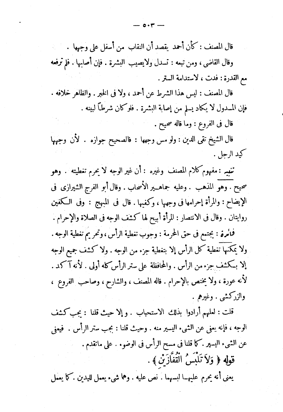 تَنْبِيهٌ: مَفْهُومُ كَلَامِ الْمُصَنِّفِ وَغَيْرِهِ: أَنَّ غَيْرَ الْوَجْهِ لَا يَحْرُمُ تَغْطِيَتُهُ، وَهُوَ صَحِيحٌ، وَهُوَ الْمَذْهَبُ، وَعَلَيْهِ جَمَاهِيرُ الْأَصْحَابِ، وَقَالَ أَبُو الْفَرَجِ الشِّيرَازِيُّ فِي الْإِيضَاحِ: وَالْمَرْأَةُ إحْرَامُهَا فِي وَجْهِهَا، وَكَفَّيْهَا. قَالَ فِي الْمُبْهِجِ: وَفِي الْكَفَّيْنِ رِوَايَتَانِ، وَقَالَ فِي الِانْتِصَارِ: الْمَرْأَةُ أُبِيحَ لَهَا كَشْفُ الْوَجْهِ فِي الصَّلَاةِ وَالْإِحْرَامِ.