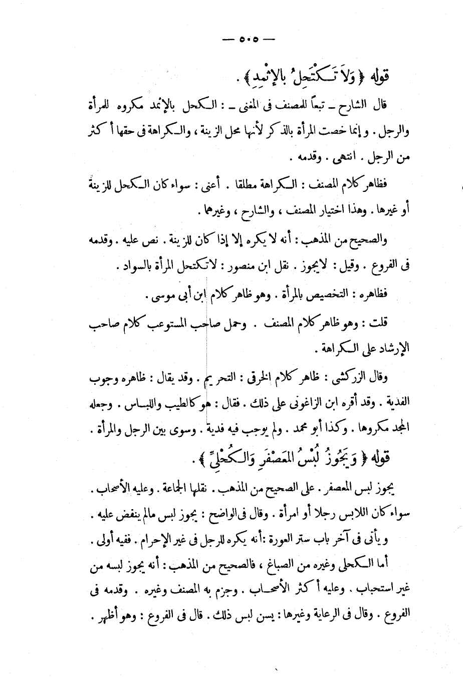 قَوْلُهُ (وَلَا تَكْتَحِلُ بِالْإِثْمِدِ) . قَالَ الشَّارِحُ تَبَعًا لِلْمُصَنِّفِ فِي الْمُغْنِي: الْكُحْلُ بِالْإِثْمِدِ مَكْرُوهٌ لِلْمَرْأَةِ وَالرَّجُلِ وَإِنَّمَا خَصَّ الْمَرْأَةَ بِالذِّكْرِ لِأَنَّهَا مَحَلُّ الزِّينَةِ، وَالْكَرَاهَةُ فِي حَقِّهَا أَكْثَرُ مِنْ الرَّجُلِ. انْتَهَى، وَقَدَّمَهُ، فَظَاهِرُ كَلَامِ الْمُصَنِّفِ: الْكَرَاهَةُ مُطْلَقًا. أَعْنِي: سَوَاءً كَانَ الْكُحْلُ لِلزِّينَةِ أَوْ غَيْرِهَا، وَهَذَا اخْتِيَارُ الْمُصَنِّفِ، وَالشَّارِحِ، وَغَيْرِهِمَا، وَالصَّحِيحُ مِنْ الْمَذْهَبِ: أَنَّهُ لَا يُكْرَهُ إلَّا إذَا كَانَ لِلزِّينَةِ، نَصَّ عَلَيْهِ، وَقَدَّمَهُ فِي الْفُرُوعِ، وَقِيلَ: لَا يَجُوزُ. نَقَلَ ابْنُ مَنْصُورٍ: لَا تَكْتَحِلُ الْمَرْأَةُ بِالسَّوَادِ. فَظَاهِرُهُ: التَّخْصِيصُ بِالْمَرْأَةِ، وَهُوَ ظَاهِرُ كَلَامِ ابْنِ أَبِي مُوسَى. قُلْت: وَهُوَ ظَاهِرُ كَلَامِ الْمُصَنِّفِ، وَحَمَلَ صَاحِبُ الْمُسْتَوْعِبِ كَلَامَ صَاحِبِ الْإِرْشَادِ عَلَى الْكَرَاهَةِ، وَقَالَ الزَّرْكَشِيُّ: ظَاهِرُ كَلَامِ الْخِرَقِيِّ: التَّحْرِيمُ، وَقَدْ قَالَ: ظَاهِرُهُ وُجُوبُ الْفِدْيَةِ. وَقَدْ أَقَرَّهُ ابْنُ الزَّاغُونِيِّ عَلَى ذَلِكَ، فَقَالَ: هُوَ كَالطِّيبِ وَاللِّبَاسِ، وَجَعَلَهُ الْمَجْدُ مَكْرُوهًا. كَذَا أَبُو مُحَمَّدٍ، وَلَمْ يُوجِبْ فِيهِ فِدْيَةً، وَسَوَّى بَيْنَ الرَّجُلِ وَالْمَرْأَةِ.