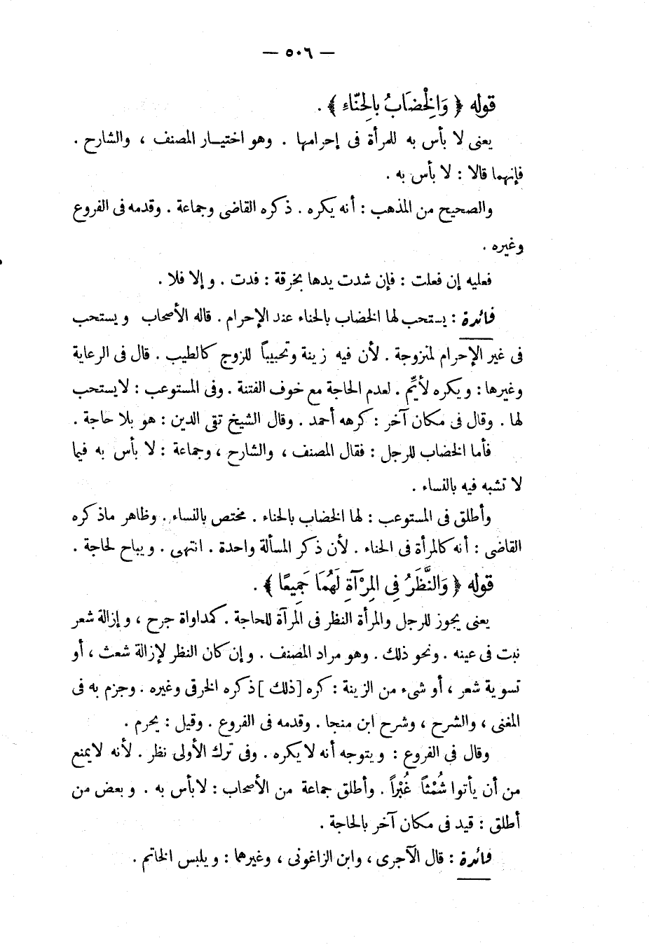 فَائِدَةٌ: يُسْتَحَبُّ لَهَا الْخِضَابُ بِالْحِنَّاءِ عِنْدَ الْإِحْرَامِ. قَالَهُ الْأَصْحَابُ وَيُسْتَحَبُّ فِي غَيْرِ الْإِحْرَامِ لِمُتَزَوِّجَةٍ؛ لِأَنَّ فِيهِ زِينَةً وَتَحْبِيبًا لِلزَّوْجِ كَالطِّيبِ. قَالَ فِي الرِّعَايَةِ وَغَيْرِهَا: وَيُكْرَهُ لِأَيِّمٍ؛ لِعَدَمِ الْحَاجَةِ مَعَ خَوْفِ الْفِتْنَةِ، وَفِي الْمُسْتَوْعِبِ: لَا يُسْتَحَبُّ لَهَا، وَقَالَ فِي مَكَان آخَرَ: كَرِهَهُ أَحْمَدُ، وَقَالَ الشَّيْخُ تَقِيُّ الدِّينِ: هُوَ بِلَا حَاجَةٍ، فَأَمَّا الْخِضَابُ لِلرَّجُلِ: فَقَالَ الْمُصَنِّفُ، وَالشَّارِحُ، وَجَمَاعَةٌ: لَا بَأْسَ بِهِ فِيمَا لَا تَشَبُّهَ فِيهِ بِالنِّسَاءِ، وَأَطْلَقَ فِي الْمُسْتَوْعِبِ: لَهَا الْخِضَابُ بِالْحِنَّاءِ. مُخْتَصٌّ بِالنِّسَاءِ، وَظَاهِرُ مَا ذَكَرَهُ الْقَاضِي: أَنَّهُ كَالْمَرْأَةِ فِي الْحِنَّاءِ؛ لِأَنَّ ذِكْرَ الْمَسْأَلَةِ وَاحِدَةٌ. انْتَهَى، وَيُبَاحُ لِحَاجَةٍ.