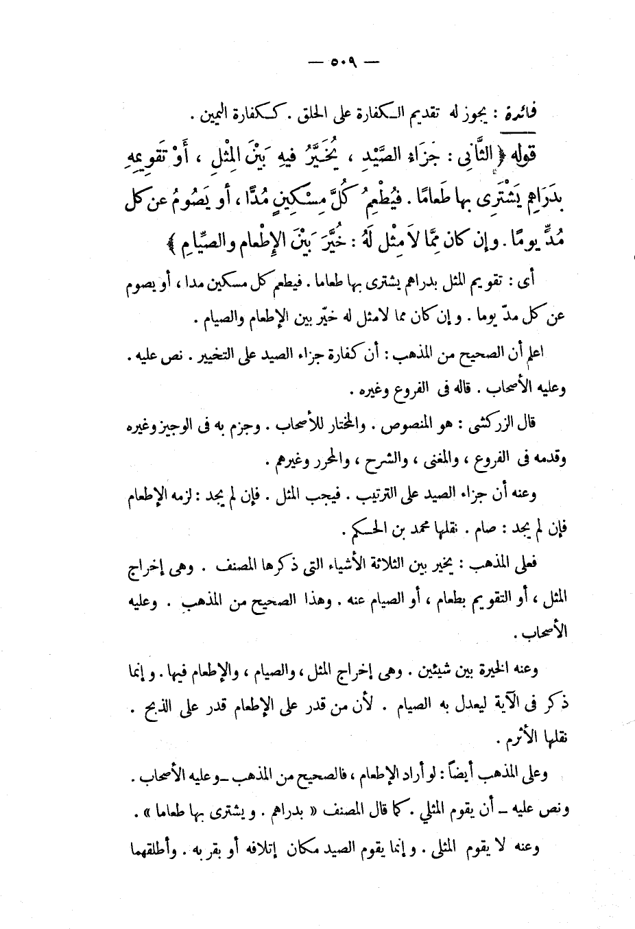 قَوْلُهُ (الثَّانِي: جَزَاءُ الصَّيْدِ.، يُخَيَّرُ فِيهِ بَيْنَ الْمِثْلِ، أَوْ تَقْوِيمِهِ بِدَرَاهِمَ يَشْتَرِي بِهَا طَعَامًا، فَيُطْعِمُ كُلَّ مِسْكِينٍ مُدًّا، أَوْ يَصُومُ عَنْ كُلِّ مُدٍّ يَوْمًا، وَإِنْ كَانَ لَا مِثْلَ لَهُ: خُيِّرَ بَيْنَ الْإِطْعَامِ وَالصِّيَامِ) أَيْ: تَقْوِيمُ الْمِثْلِ بِدَرَاهِمَ يَشْتَرِي بِهَا طَعَامًا، فَيُطْعِمُ كُلَّ مِسْكِينٍ مُدًّا، أَوْ يَصُومُ عَنْ كُلِّ مُدٍّ يَوْمًا، وَإِنْ كَانَ مِمَّا لَا مِثْلَ لَهُ خُيِّرَ بَيْنَ الْإِطْعَامِ وَالصِّيَامِ. اعْلَمْ أَنَّ الصَّحِيحَ مِنْ الْمَذْهَبِ: أَنَّ كَفَّارَةَ جَزَاءِ الصَّيْدِ عَلَى التَّخْيِيرِ، نَصَّ عَلَيْهِ، وَعَلَيْهِ الْأَصْحَابُ. قَالَهُ فِي الْفُرُوعِ وَغَيْرِهِ. قَالَ الزَّرْكَشِيُّ: هُوَ الْمَنْصُوصُ، وَالْمُخْتَارُ لِلْأَصْحَابِ، وَجَزَمَ بِهِ فِي الْوَجِيزِ وَغَيْرِهِ وَقَدَّمَهُ فِي الْفُرُوعِ، وَالْمُغْنِي، وَالشَّرْحِ، وَالْمُحَرَّرِ وَغَيْرِهِمْ، وَعَنْهُ أَنَّ جَزَاءَ الصَّيْدِ عَلَى التَّرْتِيبِ فَيَجِبُ الْمِثْلُ، فَإِنْ لَمْ يَجِدْ: لَزِمَهُ الْإِطْعَامُ فَإِنْ لَمْ يَجِدْ: صَامَ. نَقَلَهَا مُحَمَّدُ بْنُ الْحَكَمِ، فَعَلَى الْمَذْهَبِ: يُخَيَّرُ بَيْنَ الثَّلَاثَةِ الْأَشْيَاءِ الَّتِي ذَكَرَهَا الْمُصَنِّفُ، وَهِيَ إخْرَاجُ الْمِثْلِ، أَوْ التَّقْوِيمُ بِطَعَامٍ، أَوْ الصِّيَامُ عَنْهُ، وَهَذَا الصَّحِيحُ مِنْ الْمَذْهَبِ، وَعَلَيْهِ الْأَصْحَابُ، وَعَنْهُ الْخِيَرَةُ بَيْنَ شَيْئَيْنِ، وَهِيَ إخْرَاجُ الْمِثْلِ، وَالصِّيَامُ، وَالْإِطْعَامُ فِيهَا. وَإِنَّمَا ذَكَرَ فِي الْآيَةِ لِيَعْدِلَ بِهِ الصِّيَامَ؛ لِأَنَّ مَنْ قَدَرَ عَلَى الْإِطْعَامِ قَدَرَ عَلَى الذَّبْحِ. نَقَلَهَا الْأَثْرَمُ. وَعَلَى الْمَذْهَبِ أَيْضًا: لَوْ أَرَادَ الْإِطْعَامَ، فَالصَّحِيحُ مِنْ الْمَذْهَبِ وَعَلَيْهِ الْأَصْحَابُ، وَنَصَّ عَلَيْهِ أَنْ يُقَوِّمَ الْمِثْلِيَّ. كَمَا قَالَ الْمُصَنِّفُ " بِدَرَاهِمَ. وَيَشْتَرِيَ بِهَا طَعَامًا "، وَعَنْهُ لَا يُقَوِّمُ الْمِثْلِيَّ، وَإِنَّمَا يُقَوِّمُ الصَّيْدَ مَكَانَ إتْلَافِهِ أَوْ بِقُرْبِهِ، وَأَطْلَقَهُمَا