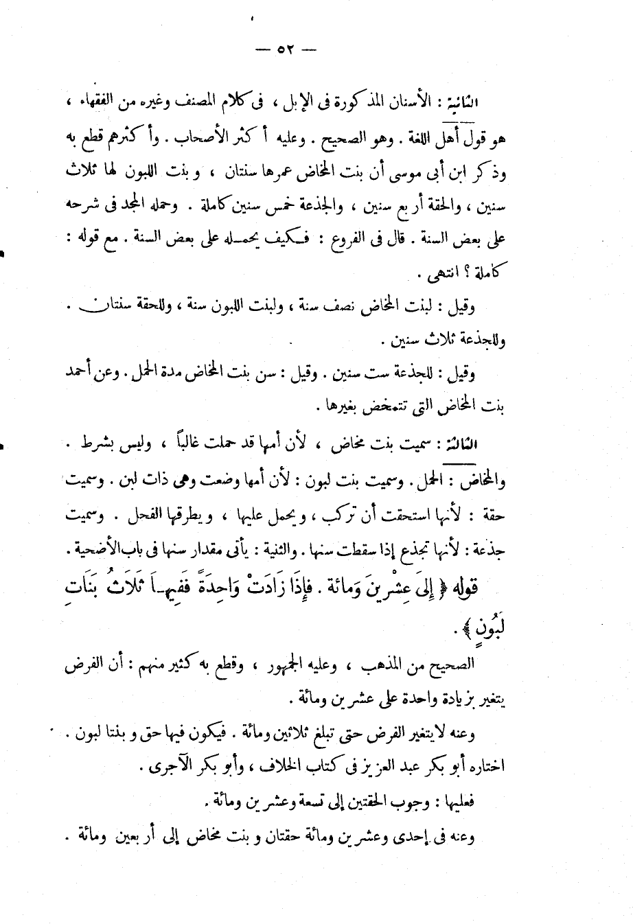 الثَّانِيَةُ: الْأَسْنَانُ الْمَذْكُورَةُ فِي الْإِبِلِ، فِي كَلَامِ الْمُصَنِّفِ وَغَيْرِهِ مِنْ الْفُقَهَاءِ، هُوَ قَوْلُ أَهْلِ اللُّغَةِ، وَهُوَ الصَّحِيحُ، وَعَلَيْهِ أَكْثَرُ الْأَصْحَابِ، وَأَكْثَرُهُمْ قَطَعَ بِهِ وَذَكَرَ ابْنُ أَبِي مُوسَى أَنَّ بِنْتَ الْمَخَاضِ عُمُرُهَا سَنَتَانِ، وَبِنْتُ اللَّبُونِ لَهَا ثَلَاثُ سِنِينَ، وَالْحِقَّةُ أَرْبَعُ سِنِينَ، وَالْجَذَعَةُ خَمْسُ سِنِينَ كَامِلَةٌ، وَحَمَلَهُ الْمَجْدُ فِي شَرْحِهِ عَلَى بَعْضِ السَّنَةِ. قَالَ فِي الْفُرُوعِ: فَكَيْفَ يَحْمِلُهُ عَلَى بَعْضِ السَّنَةِ، مَعَ قَوْلِهِ: كَامِلَةٌ؟ . انْتَهَى. وَقِيلَ: لِبِنْتِ الْمَخَاضِ نِصْفُ سَنَةٍ، وَلِبِنْتِ اللَّبُونِ سَنَةٌ، وَلِلْحِقَّةِ سَنَتَانِ، وَلِلْجَذَعَةِ ثَلَاثُ سِنِينَ، وَقِيلَ: لِلْجَذَعَةِ سِتُّ سِنِينَ، وَقِيلَ: سِنُّ بِنْتِ الْمَخَاضِ مُدَّةُ الْحَمْلِ، وَعَنْ أَحْمَدَ بِنْتُ الْمَخَاضِ الَّتِي أُمُّهَا تَتَمَخَّضُ بِغَيْرِهَا.