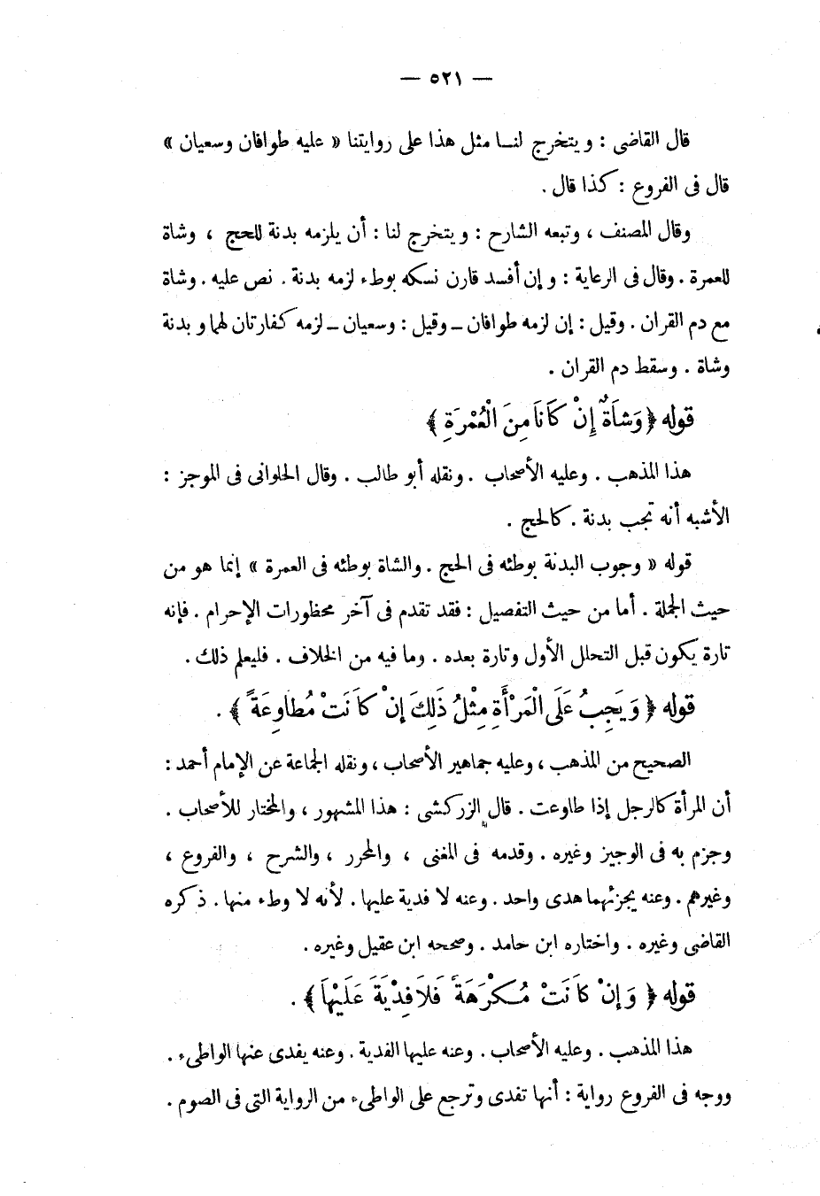 قَوْلُهُ (وَيَجِبُ عَلَى الْمَرْأَةِ مِثْلُ ذَلِكَ إنْ كَانَتْ مُطَاوِعَةً) ، الصَّحِيحُ مِنْ الْمَذْهَبِ، وَعَلَيْهِ جَمَاهِيرُ الْأَصْحَابِ، وَنَقَلَهُ الْجَمَاعَةُ عَنْ الْإِمَامِ أَحْمَدَ: أَنَّ الْمَرْأَةَ كَالرَّجُلِ إذَا طَاوَعَتْ. قَالَ الزَّرْكَشِيُّ: هَذَا الْمَشْهُورُ، وَالْمُخْتَارُ لِلْأَصْحَابِ، وَجَزَمَ بِهِ فِي الْوَجِيزِ وَغَيْرِهِ، وَقَدَّمَهُ فِي الْمُغْنِي، وَالْمُحَرَّرِ، وَالشَّرْحِ، وَالْفُرُوعِ، وَغَيْرِهِمْ، وَعَنْهُ يُجْزِئُهُمَا هَدْيٌ وَاحِدٌ، وَعَنْهُ لَا فِدْيَةَ عَلَيْهَا؛ لِأَنَّهُ لَا وَطْءَ مِنْهَا. ذَكَرَهُ الْقَاضِي وَغَيْرُهُ، وَاخْتَارَهُ ابْنُ حَامِدٍ، وَصَحَّحَهُ ابْنُ عَقِيلٍ وَغَيْرُهُ. قَوْلُهُ (وَإِنْ كَانَتْ مُكْرَهَةً فَلَا فِدْيَةَ عَلَيْهَا) . هَذَا الْمَذْهَبُ، وَعَلَيْهِ الْأَصْحَابُ، وَعَنْهُ عَلَيْهَا الْفِدْيَةُ. وَعَنْهُ يَفْدِي عَنْهَا الْوَاطِئُ، وَوَجَّهَ فِي الْفُرُوعِ رِوَايَةَ: أَنَّهَا تَفْدِي وَتَرْجِعُ عَلَى الْوَاطِئِ مِنْ الرِّوَايَةِ الَّتِي فِي الصَّوْمِ.