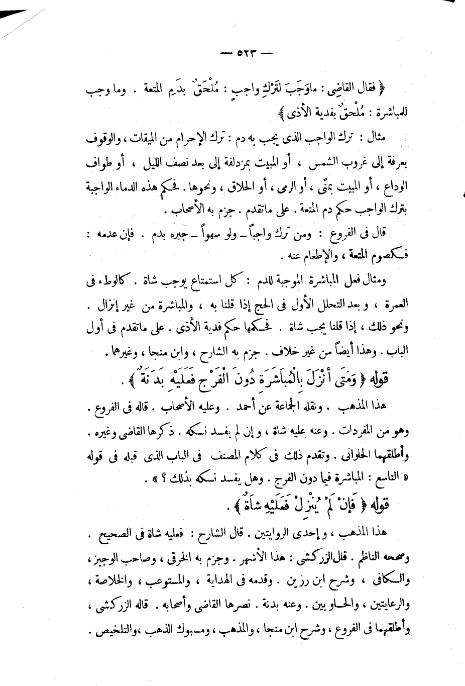 (فَقَالَ الْقَاضِي: مَا وَجَبَ لِتَرْكِ وَاجِبٍ: مُلْحَقٌ بِدَمِ الْمُتْعَةِ، وَمَا وَجَبَ لِلْمُبَاشَرَةِ: مُلْحَقٌ بِفِدْيَةِ الْأَذَى) مِثَالٌ: تَرْكُ الْوَاجِبِ الَّذِي يَجِبُ بِهِ دَمٌ: تَرْكُ الْإِحْرَامِ مِنْ الْمِيقَاتِ، وَالْوُقُوفُ بِعَرَفَةَ إلَى غُرُوبِ الشَّمْسِ، أَوْ الْمَبِيتُ بِمُزْدَلِفَةَ إلَى بَعْدِ نِصْفِ اللَّيْلِ، أَوْ طَوَافُ الْوَدَاعِ، أَوْ الْمَبِيتُ بِمِنًى، أَوْ الرَّمْيُ، أَوْ الْحِلَاقُ، وَنَحْوُهَا، فَحُكْمُ هَذِهِ الدِّمَاءِ الْوَاجِبَةِ بِتَرْكِ الْوَاجِبِ حُكْمُ دَمِ الْمُتْعَةِ عَلَى مَا تَقَدَّمَ، جَزَمَ بِهِ الْأَصْحَابُ. قَالَ فِي الْفُرُوعِ: وَمَنْ تَرَكَ وَاجِبًا وَلَوْ سَهْوًا جَبَرَهُ بِدَمٍ، فَإِنْ عَدِمَهُ: فَكَصَوْمِ الْمُتْعَةِ، وَالْإِطْعَامِ عَنْهُ، وَمِثَالُ فِعْلِ الْمُبَاشَرَةِ الْمُوجِبَةِ لِلدَّمِ: كُلُّ اسْتِمْتَاعٍ يُوجِبُ شَاةً. كَالْوَطْءِ فِي الْعُمْرَةِ، وَبَعْدَ التَّحَلُّلِ الْأَوَّلِ فِي الْحَجِّ إذَا قُلْنَا بِهِ، وَالْمُبَاشَرَةِ مِنْ غَيْرِ إنْزَالٍ، وَنَحْوِ ذَلِكَ، إذَا قُلْنَا يَجِبُ شَاةٌ، فَحُكْمُهَا حُكْمُ فِدْيَةِ الْأَذَى عَلَى مَا تَقَدَّمَ فِي أَوَّلِ الْبَابِ، وَهَذَا أَيْضًا مِنْ غَيْرِ خِلَافٍ، جَزَمَ بِهِ الشَّارِحُ، وَابْنُ مُنَجَّى، وَغَيْرُهُمَا.