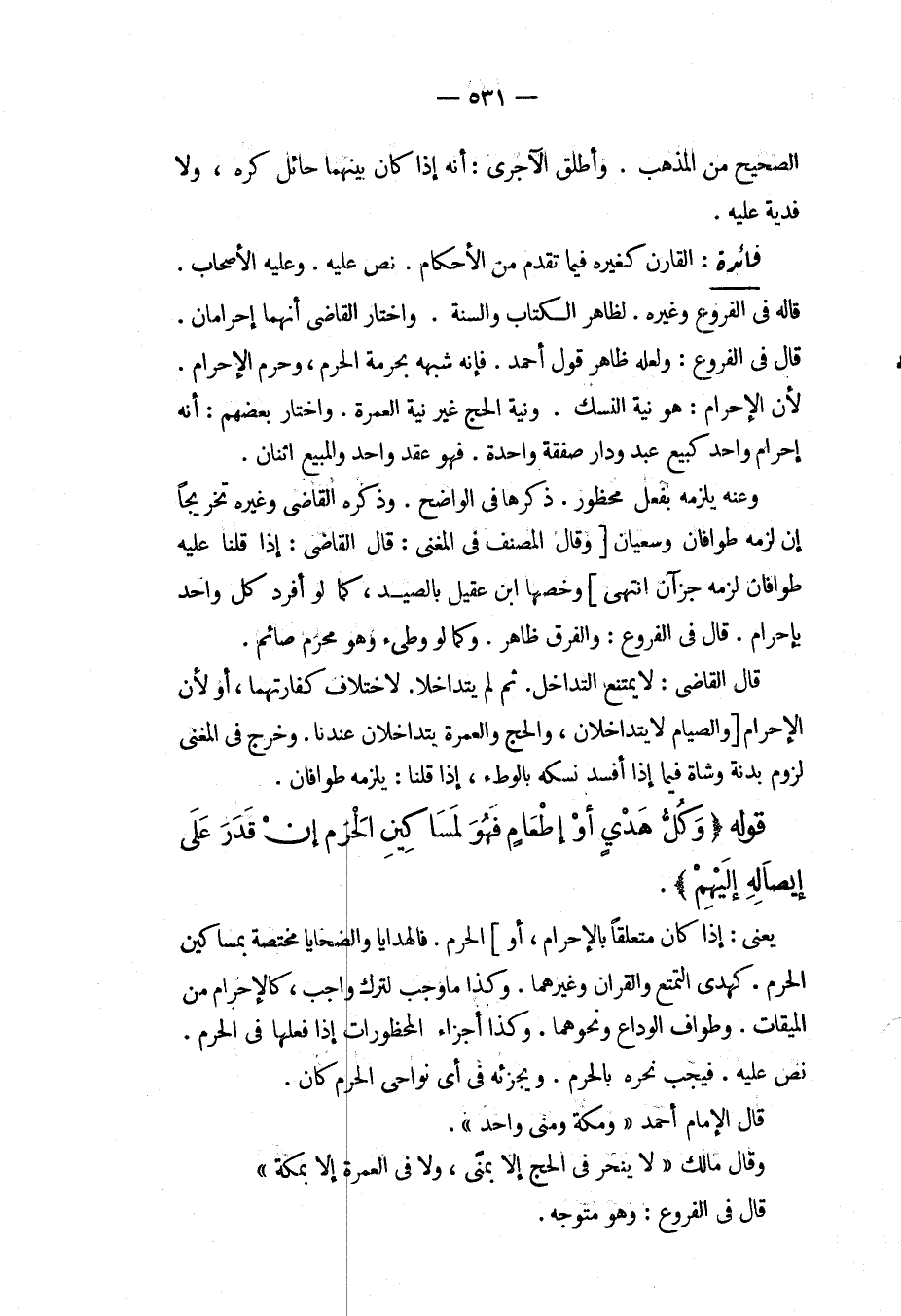 فَائِدَةٌ: الْقَارِنُ كَغَيْرِهِ فِيمَا تَقَدَّمَ مِنْ الْأَحْكَامِ، نَصَّ عَلَيْهِ، وَعَلَيْهِ الْأَصْحَابُ. قَالَهُ فِي الْفُرُوعِ وَغَيْرِهِ؛ لِظَاهِرِ الْكِتَابِ وَالسُّنَّةِ، وَاخْتَارَ الْقَاضِي أَنَّهُمَا إحْرَامَانِ. قَالَ فِي الْفُرُوعِ: وَلَعَلَّهُ ظَاهِرُ قَوْلِ أَحْمَدَ، فَإِنَّهُ شَبَّهَهُ بِحُرْمَةِ الْحَرَمِ، وَحَرُمَ الْإِحْرَامُ؛ لِأَنَّ الْإِحْرَامَ: هُوَ نِيَّةُ النُّسُكِ، وَنِيَّةُ الْحَجِّ غَيْرُ نِيَّةِ الْعُمْرَةِ، وَاخْتَارَ بَعْضُهُمْ: أَنَّهُ إحْرَامٌ وَاحِدٌ كَبَيْعِ عَبْدٍ وَدَارٍ صَفْقَةً وَاحِدَةً، فَهُوَ عَقْدٌ وَاحِدٌ وَالْمَبِيعُ اثْنَانِ، وَعَنْهُ يَلْزَمُهُ بِفِعْلِ مَحْظُورٍ. ذَكَرَهَا فِي الْوَاضِحِ، وَذَكَرَهُ الْقَاضِي وَغَيْرُهُ تَخْرِيجًا إنْ لَزِمَهُ طَوَافَانِ وَسَعْيَانِ [وَقَالَ الْمُصَنِّفُ فِي الْمُغْنِي: قَالَ الْقَاضِي: إذَا قُلْنَا عَلَيْهِ طَوَافَانِ لَزِمَهُ جَزَاءَانِ انْتَهَى] وَخَصَّهَا ابْنُ عَقِيلٍ بِالصَّيْدِ كَمَا لَوْ أَفْرَدَ كُلَّ وَاحِدٍ بِإِحْرَامٍ. قَالَ فِي الْفُرُوعِ: وَالْفَرْقُ ظَاهِرٌ. وَكَمَا لَوْ وَطِئَ وَهُوَ مُحْرِمٌ صَائِمٌ. قَالَ الْقَاضِي: لَا يَمْتَنِعُ التَّدَاخُلُ. ثُمَّ لَمْ يَتَدَاخَلَا؛ لِاخْتِلَافِ كَفَّارَتِهِمَا، أَوْ لِأَنَّ الْإِحْرَامَ [وَالصِّيَامَ لَا يَتَدَاخَلَانِ] ، وَالْحَجُّ وَالْعُمْرَةُ يَتَدَاخَلَانِ عِنْدَنَا. وَخَرَجَ فِي الْمُغْنِي لُزُومُ بَدَنَةٍ وَشَاةٍ فِيمَا إذَا أَفْسَدَ نُسُكَهُ بِالْوَطْءِ، إذَا قُلْنَا: يَلْزَمُهُ طَوَافَانِ.