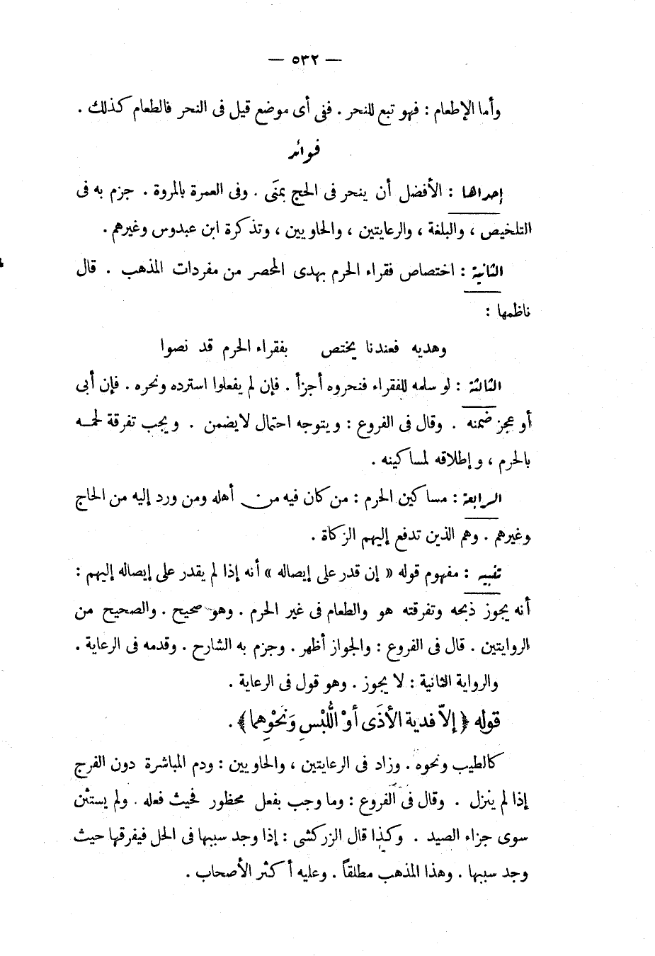 الثَّانِيَةُ: اخْتِصَاصُ فُقَرَاءِ الْحَرَمِ بِهَدْيِ الْمُحْصَرِ مِنْ مُفْرَدَاتِ الْمَذْهَبِ. قَالَ نَاظِمُهَا: وَهَدْيُهُ فَعِنْدَنَا يَخْتَصُّ بِفُقَرَاءِ الْحَرَمِ قَدْ نَصُّوا. الثَّالِثَةُ: لَوْ سَلَّمَهُ لِلْفُقَرَاءِ فَنَحَرُوهُ أَجْزَأَ، فَإِنْ لَمْ يَفْعَلُوا اسْتَرَدَّهُ وَنَحَرَهُ، فَإِنْ أَبَى أَوْ عَجَزَ ضَمِنَهُ، وَقَالَ فِي الْفُرُوعِ: وَيَتَوَجَّهُ احْتِمَالٌ لَا يَضْمَنُ، وَيَجِبُ تَفْرِقَةُ لَحْمِهِ بِالْحَرَمِ، وَإِطْلَاقُهُ لِمَسَاكِينِهِ. الرَّابِعَةُ: مَسَاكِينُ الْحَرَمِ: مَنْ كَانَ فِيهِ مِنْ أَهْلِهِ وَمَنْ وَرَدَ إلَيْهِ مِنْ الْحَاجِّ وَغَيْرِهِمْ، وَهُمْ الَّذِينَ تُدْفَعُ إلَيْهِمْ الزَّكَاةُ.