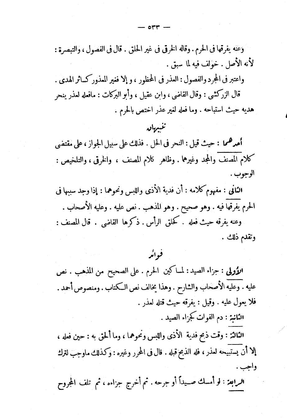تَنْبِيهَانِ: أَحَدُهُمَا: حَيْثُ قِيلَ: النَّحْرُ فِي الْحِلِّ، فَذَلِكَ عَلَى سَبِيلِ الْجَوَازِ، عَلَى مُقْتَضَى كَلَامِ الْمُصَنِّفِ وَالْمَجْدِ وَغَيْرِهِمَا، وَظَاهِرُ كَلَامِ الْمُصَنِّفِ، وَالْخِرَقِيِّ، وَالتَّلْخِيصِ: الْوُجُوبُ. الثَّانِي: مَفْهُومُ كَلَامِهِ: أَنَّ فِدْيَةَ الْأَذَى وَاللُّبْسِ وَنَحْوِهِمَا: إذَا وَجَدَ سَبَبَهَا فِي الْحَرَمِ يُفَرِّقُهَا فِيهِ، وَهُوَ صَحِيحٌ، وَهُوَ الْمَذْهَبُ، نَصَّ عَلَيْهِ، وَعَلَيْهِ الْأَصْحَابُ، وَعَنْهُ يُفَرِّقُهُ حَيْثُ فَعَلَهُ. كَحَلْقِ الرَّأْسِ. ذَكَرَهَا الْقَاضِي. قَالَ الْمُصَنِّفُ: وَتَقَدَّمَ ذَلِكَ.