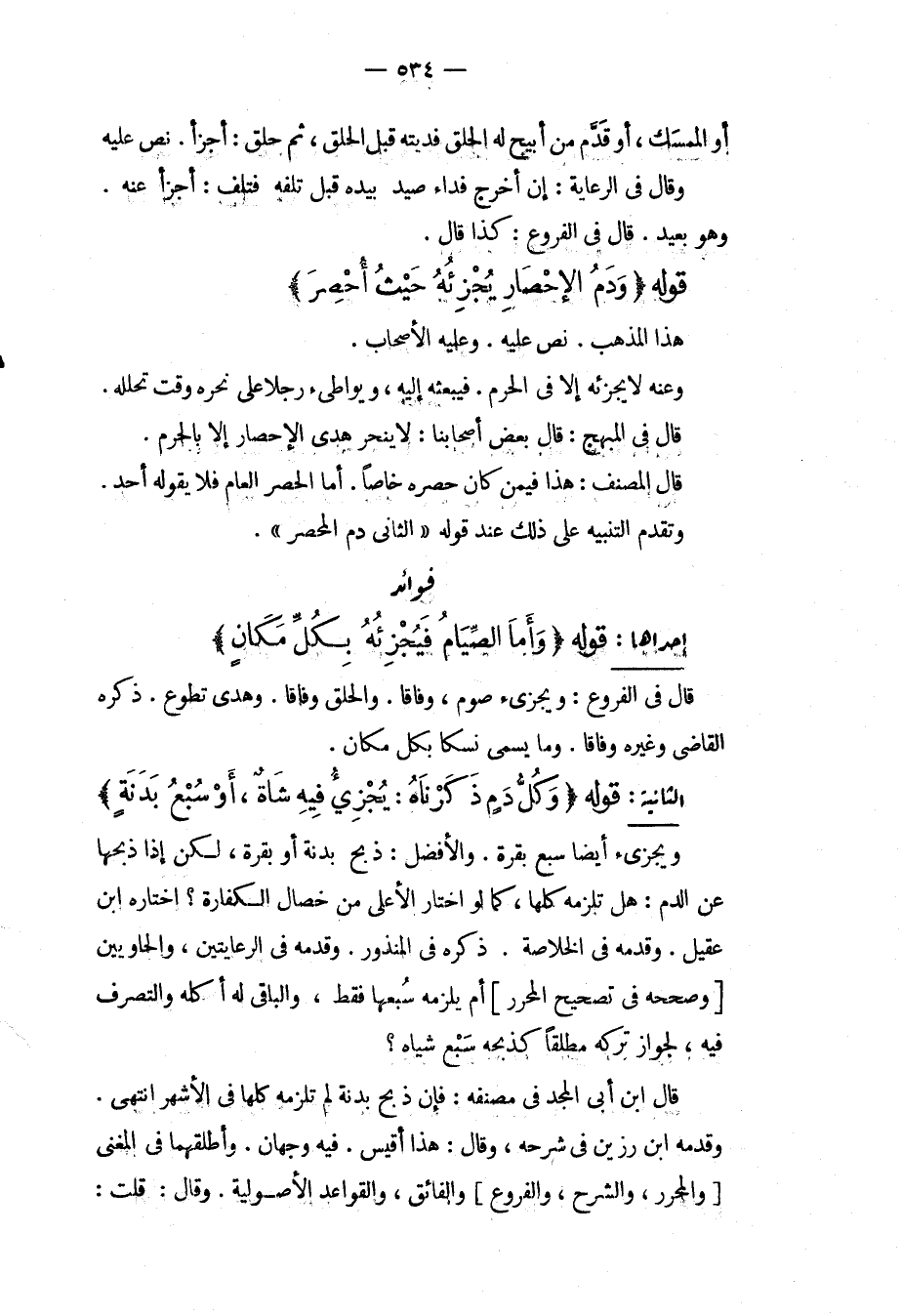فَوَائِدُ. إحْدَاهُمَا: قَوْلُهُ (وَأَمَّا الصِّيَامُ فَيُجْزِئُهُ بِكُلِّ مَكَان) قَالَ فِي الْفُرُوعِ: وَيُجْزِئُ صَوْمٌ وِفَاقًا، وَالْحَلْقُ وِفَاقًا، وَهَدْيُ تَطَوُّعٍ. ذَكَرَهُ الْقَاضِي وَغَيْرُهُ وِفَاقًا، وَمَا يُسَمَّى نُسُكًا بِكُلِّ مَكَان. الثَّانِيَةُ قَوْلُهُ (كُلُّ دَمٍ ذَكَرْنَاهُ: يُجْزِئُ فِيهِ شَاةٌ، أَوْ سُبُعُ بَدَنَةٍ) وَيُجْزِئُ أَيْضًا سُبُعُ بَقَرَةٍ، وَالْأَفْضَلُ: ذَبْحُ بَدَنَةٍ أَوْ بَقَرَةٍ، لَكِنْ إذَا ذَبَحَهَا عَنْ الدَّمِ: هَلْ تَلْزَمُهُ كُلُّهَا، كَمَا لَوْ اخْتَارَ الْأَعْلَى مِنْ خِصَالِ الْكَفَّارَةِ؟ اخْتَارَهُ ابْنُ عَقِيلٍ، وَقَدَّمَهُ فِي الْخُلَاصَةِ. ذَكَرَهُ فِي الْمَنْذُورِ، وَقَدَّمَهُ فِي الرِّعَايَتَيْنِ، وَالْحَاوِيَيْنِ [وَصَحَّحَهُ فِي تَصْحِيحِ الْمُحَرَّرِ] أَمْ يَلْزَمُهُ سُبُعُهَا فَقَطْ، وَالْبَاقِي لَهُ أَكْلُهُ وَالتَّصَرُّفُ فِيهِ، لِجَوَازِ تَرْكِهِ مُطْلَقًا كَذَبْحِهِ سَبْعَ شِيَاهٍ؟ قَالَ ابْنُ أَبِي الْمَجْدِ فِي مُصَنَّفِهِ: فَإِنْ ذَبَحَ بَدَنَةً لَمْ تَلْزَمْهُ كُلُّهَا فِي الْأَشْهَرِ. انْتَهَى. وَقَدَّمَهُ ابْنُ رَزِينٍ فِي شَرْحِهِ، وَقَالَ: هَذَا أَقْيَسُ، فِيهِ وَجْهَانِ، وَأَطْلَقَهُمَا فِي الْمُغْنِي [وَالْمُحَرَّرِ، وَالشَّرْحِ، وَالْفُرُوعِ] وَالْفَائِقِ، وَالْقَوَاعِدِ الْأُصُولِيَّةِ، وَقَالَ: قُلْت: