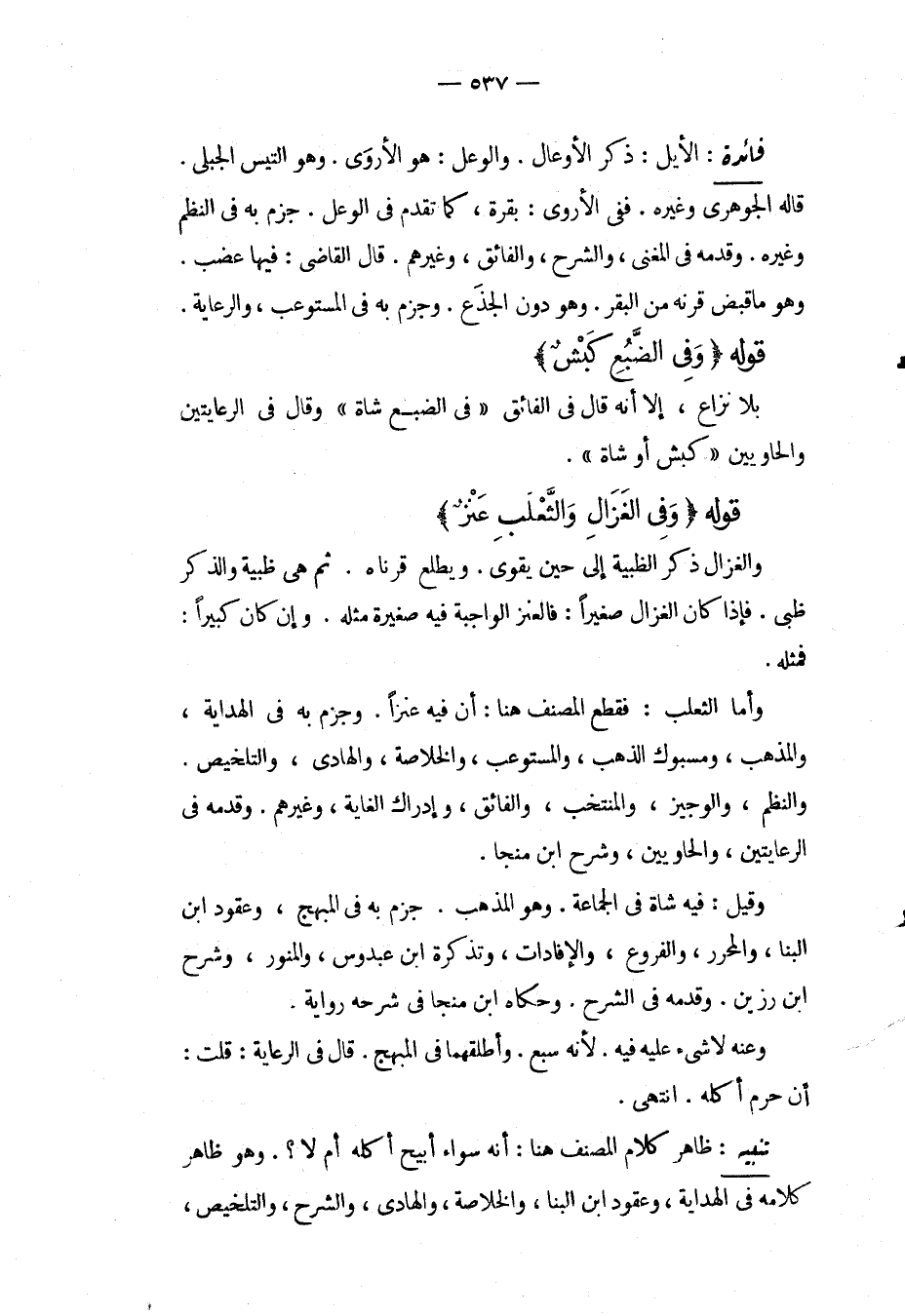 فَائِدَةٌ: الْأَيْلُ: ذَكَرُ الْأَوْعَالِ، وَالْوَعْلُ: هُوَ الْأَرْوَى. وَهُوَ التَّيْسُ الْجَبَلِيُّ. قَالَهُ الْجَوْهَرِيُّ وَغَيْرُهُ، فَفِي الْأَرْوَى: بَقَرَةٌ، كَمَا تَقَدَّمَ فِي الْوَعْلِ، جَزَمَ بِهِ فِي النَّظْمِ وَغَيْرِهِ، وَقَدَّمَهُ فِي الْمُغْنِي، وَالشَّرْحِ، وَالْفَائِقِ، وَغَيْرِهِمْ. قَالَ الْقَاضِي: فِيهَا عَضَبٌ، وَهُوَ مَا قَبَضَ قَرْنُهُ مِنْ الْبَقَرِ، وَهُوَ دُونَ الْجَذَعِ، وَجَزَمَ بِهِ فِي الْمُسْتَوْعِبِ، وَالرِّعَايَةِ.