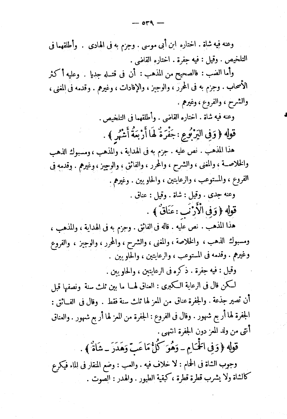 وَعَنْهُ فِيهِ شَاةٌ، اخْتَارَهُ ابْنُ أَبِي مُوسَى. وَجَزَمَ بِهِ فِي الْهَادِي، وَأَطْلَقَهُمَا فِي التَّلْخِيصِ، وَقِيلَ: فِيهِ جُفْرَةٌ، اخْتَارَهُ الْقَاضِي، وَأَمَّا الضَّبُّ: فَالصَّحِيحُ مِنْ الْمَذْهَبِ: أَنَّ فِي قَتْلِهِ جَدْيًا. وَعَلَيْهِ أَكْثَرُ الْأَصْحَابِ، وَجَزَمَ بِهِ فِي الْمُحَرَّرِ، وَالْوَجِيزِ، وَالْإِفَادَاتِ، وَغَيْرِهِمْ، وَقَدَّمَهُ فِي الْمُغْنِي، وَالشَّرْحِ، وَالْفُرُوعِ، وَغَيْرِهِمْ. وَعَنْهُ فِيهِ شَاةٌ، اخْتَارَهُ الْقَاضِي، وَأَطْلَقَهُمَا فِي التَّلْخِيصِ.