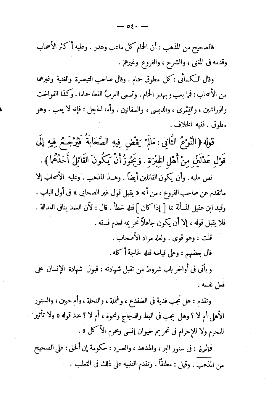 قَوْلُهُ (النَّوْعُ الثَّانِي: مَا لَمْ يَقْضِ فِيهِ الصَّحَابَةُ فَيَرْجِعُ فِيهِ إلَى قَوْلِ عَدْلَيْنِ مِنْ أَهْلِ الْخِبْرَةِ، وَيَجُوزُ أَنْ يَكُونَ الْقَاتِلُ أَحَدَهُمَا) ، نَصَّ عَلَيْهِ، وَأَنْ يَكُونَ الْقَاتِلَيْنِ أَيْضًا. وَهَذَا الْمَذْهَبُ، وَعَلَيْهِ الْأَصْحَابُ إلَّا مَا تَقَدَّمَ عَنْ صَاحِبِ الْفُرُوعِ، مِنْ أَنَّهُ " يُقْبَلُ قَوْلُ غَيْرِ الصَّحَابِيِّ " فِي أَوَّلِ الْبَابِ، وَقَيَّدَ ابْنُ عَقِيلٍ الْمَسْأَلَةَ بِمَا [إذَا كَانَ] قَتَلَهُ خَطَأً. قَالَ: لِأَنَّ الْعَمْدَ يُنَافِي الْعَدَالَةَ، فَلَا يُقْبَلُ قَوْلُهُ، إلَّا أَنْ يَكُونَ جَاهِلًا تَحْرِيمَهُ لِعَدَمِ فِسْقِهِ. قُلْت: وَهُوَ قَوِيٌّ، وَلَعَلَّهُ مُرَادُ الْأَصْحَابِ. قَالَ بَعْضُهُمْ: وَعَلَى قِيَاسِهِ قَتْلُهُ لِحَاجَةِ أَكْلِهِ. وَيَأْتِي فِي أَوَاخِرِ بَابِ شُرُوطِ مَنْ تُقْبَلُ شَهَادَتُهُ: قَبُولُ شَهَادَةِ الْإِنْسَانِ عَلَى فِعْلِ نَفْسِهِ. وَتَقَدَّمَ: هَلْ تَجِبُ فِدْيَةٌ فِي الضُّفْدَعِ، وَالنَّمْلَةِ، وَالنَّحْلَةِ، وَأُمِّ حُبَيْنٍ، وَالسِّنَّوْرِ الْأَهْلِيِّ أَمْ لَا؟ وَهَلْ يَجِبُ فِي الْبَطِّ وَالدَّجَاجِ وَنَحْوِهِ، أَمْ لَا؟ عِنْدَ قَوْلِهِ " وَلَا تَأْثِيرَ لِلْمُحْرِمِ وَلَا لِلْإِحْرَامِ فِي تَحْرِيمِ حَيَوَانٍ إنْسِيٍّ وَمُحَرَّمِ الْأَكْلِ ".