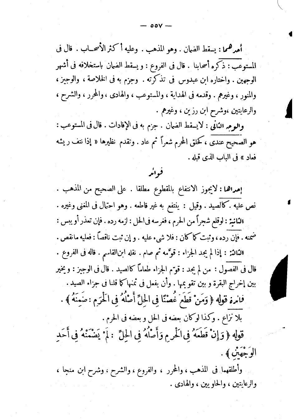 فَائِدَةٌ قَوْلُهُ (وَمَنْ قَطَعَ غُصْنًا فِي الْحِلِّ أَصْلُهُ فِي الْحَرَمِ: ضَمِنَهُ) . بِلَا نِزَاعٍ. كَذَا لَوْ كَانَ بَعْضُهُ فِي الْحِلِّ وَبَعْضُهُ فِي الْحَرَمِ. قَوْلُهُ (وَإِنْ قَطَعَهُ فِي الْحَرَمِ وَأَصْلُهُ فِي الْحِلِّ: لَمْ يَضْمَنْهُ فِي أَحَدِ الْوَجْهَيْنِ) ، وَأَطْلَقَهُمَا فِي الْمُذْهَبِ، وَالْمُحَرَّرِ، وَالْفُرُوعِ، وَالشَّرْحِ، وَشَرْحِ ابْنِ مُنَجَّى، وَالرِّعَايَتَيْنِ، وَالْحَاوِيَيْنِ، وَالْهَادِي.
