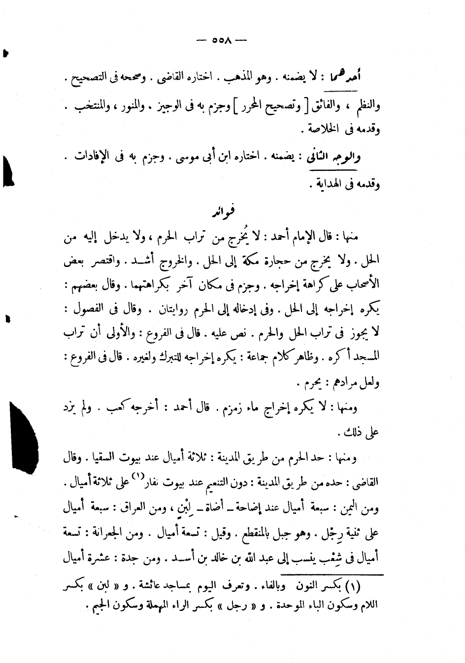 وَمِنْهَا: حَدّ الْحَرَمِ مِنْ طَرِيقِ الْمَدِينَةِ: ثَلَاثَةُ أَمْيَالٍ عِنْدَ بُيُوتِ السُّقْيَا، وَقَالَ الْقَاضِي: حَدُّهُ مِنْ طَرِيقِ الْمَدِينَةِ: دُونَ التَّنْعِيمِ عِنْدَ بُيُوتِ نِفَارٍ عَلَى ثَلَاثَةِ أَمْيَالٍ، وَمِنْ الْيَمَنِ: سَبْعَةُ أَمْيَالٍ عِنْدَ إضَاحَةِ أَضَاةٍ لِبْنٍ، وَمِنْ الْعِرَاقِ: سَبْعَةُ أَمْيَالٍ عَلَى ثَنِيَّةِ رِجْلٍ، وَهُوَ جَبَلٌ بِالْمُنْقَطِعِ، وَقِيلَ: تِسْعَةُ أَمْيَالٍ، وَمِنْ الْجِعْرَانَةِ: تِسْعَةُ أَمْيَالٍ فِي شِعْبٍ يُنْتَسَبُ إلَى عَبْدِ اللَّهِ بْنِ خَالِدِ بْنِ أَسَدٍ، وَمِنْ جَدَّةَ: عَشَرَةُ أَمْيَالٍ