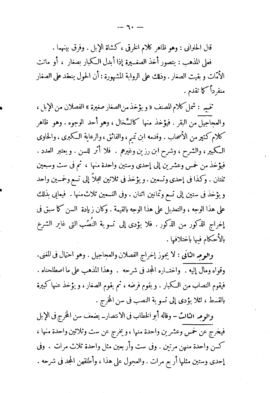 تَنْبِيهٌ: شَمِلَ كَلَامُ الْمُصَنِّفِ " وَيُؤْخَذُ مِنْ الصِّغَارِ صَغِيرَةٌ " الْفُصْلَانَ مِنْ الْإِبِلِ، وَالْعَجَاجِيلَ مِنْ الْبَقَرِ، فَيُؤْخَذُ مِنْهَا كَالسِّخَالِ، وَهُوَ أَحَدُ الْوُجُوهِ، وَهُوَ ظَاهِرُ كَلَامِ كَثِيرٍ مِنْ الْأَصْحَابِ، وَقَدَّمَهُ ابْنُ تَمِيمٍ، وَالْفَائِقُ، وَالرِّعَايَةُ الْكُبْرَى، وَالْحَاوِي الْكَبِيرُ، وَالشَّرْحُ، وَشَرْحُ ابْنِ رَزِينٍ وَغَيْرُهُمْ، فَلَا أَثَرَ لِلسِّنِّ، وَيُعْتَبَرُ الْعَدَدُ. فَيُؤْخَذُ مِنْ خَمْسٍ وَعِشْرِينَ إلَى إحْدَى وَسِتِّينَ وَاحِدَةً مِنْهَا، ثُمَّ فِي سِتٍّ وَسَبْعِينَ ثِنْتَانِ، كَذَا فِي إحْدَى وَتِسْعِينَ. وَيُؤْخَذُ فِي ثَلَاثِينَ عِجْلًا إلَى تِسْعٍ وَخَمْسِينَ وَاحِدٌ وَيُؤْخَذُ فِي سِتِّينَ إلَى تِسْعٍ وَثَمَانِينَ اثْنَانِ، وَفِي التِّسْعِينَ ثَلَاثٌ مِنْهَا، فَيُعَايَى بِذَلِكَ عَلَى هَذَا الْوَجْهِ، وَالتَّعْدِيلُ عَلَى هَذَا الْوَجْهِ بِالْقِيمَةِ، وَكَانَ زِيَادَةُ السِّنِّ كَمَا سَبَقَ فِي إخْرَاجِ الذُّكُورِ مِنْ الذُّكُورِ، فَلَا يُؤَدِّي إلَى تَسْوِيَةِ النُّصُبِ الَّتِي غَايَرَ الشَّرْعُ بِالْأَحْكَامِ فِيهَا بِاخْتِلَافِهَا. وَالْوَجْهُ الثَّانِي: لَا يَجُوزُ إخْرَاجُ الْفُصْلَانِ وَالْعَجَاجِيلِ، وَهُوَ احْتِمَالٌ فِي الْمُغْنِي، وَقَوَّاهُ وَمَالَ إلَيْهِ، وَاخْتَارَهُ الْمَجْدُ فِي شَرْحِهِ، وَهَذَا الْمَذْهَبُ عَلَى مَا اصْطَلَحْنَاهُ، فَيُقَوَّمُ النِّصَابُ مِنْ الْكِبَارِ، وَيُقَوَّمُ فَرْضُهُ، ثُمَّ يُقَوَّمُ الصِّغَارُ، وَيُؤْخَذُ عَنْهَا كَبِيرَةٌ بِالْقِسْطِ، لِئَلَّا يُؤَدِّيَ إلَى تَسْوِيَةِ النُّصُبِ فِي سِنِّ الْمُخْرَجِ، وَالْوَجْهُ الثَّالِثُ وَقَالَهُ أَبُو الْخَطَّابِ فِي الِانْتِصَارِ بِضِعْفِ سِنِّ الْمُخْرَجِ فِي الْإِبِلِ فَيُخْرِجُ عَنْ خَمْسٍ وَعِشْرِينَ وَاحِدَةً مِنْهَا، وَيُخْرِجُ عَنْ سِتٍّ وَثَلَاثِينَ وَاحِدَةً مِنْهَا، كَسِنِّ وَاحِدَةٍ مِنْهُنَّ مَرَّتَيْنِ.، وَفِي سِتٍّ وَأَرْبَعِينَ مِثْلُ وَاحِدَةٍ ثَلَاثَ مَرَّاتٍ، وَفِي إحْدَى وَسِتِّينَ مِثْلُ أَرْبَعِ مَرَّاتٍ، وَالْعُجُولُ عَلَى هَذَا، وَأَطْلَقَهُنَّ الْمَجْدُ فِي شَرْحِهِ