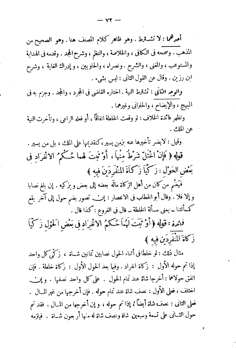 فَائِدَةٌ: قَوْلُهُ (أَوْ ثَبَتَ لَهُمَا حُكْمُ الِانْفِرَادِ فِي بَعْضِ الْحَوْلِ زُكِّيَا زَكَاةَ الْمُنْفَرِدِينَ فِيهِ) مِثَالُ ذَلِكَ: لَوْ خَلَطَا فِي أَثْنَاءِ الْحَوْلِ نِصَابَيْنِ ثَمَانِينَ شَاةً، زَكَّى كُلُّ وَاحِدٍ إذَا تَمَّ حَوْلُهُ الْأَوَّلُ: زَكَاةَ انْفِرَادٍ، وَفِيمَا بَعْدَ الْحَوْلِ الْأَوَّلِ: زَكَاةَ خُلْطَةٍ، فَإِنْ اتَّفَقَ حَوْلَاهُمَا: أَخْرَجَا شَاةً عِنْدَ تَمَامِ الْحَوْلِ عَلَى كُلِّ وَاحِدٍ نِصْفُهَا، وَإِنْ اخْتَلَفَ، فَعَلَى الْأَوَّلِ: نِصْفُ شَاةٍ عِنْدَ تَمَامِ حَوْلِهِ، فَإِنْ أَخْرَجَهَا مِنْ غَيْرِ الْمَالِ، فَعَلَى الثَّانِي: نِصْفُ شَاةٍ أَيْضًا، إذَا تَمَّ حَوْلُهُ، وَإِنْ أَخْرَجَهَا مِنْ الْمَالِ، فَقَدْ تَمَّ حَوْلُ الثَّانِي عَلَى تِسْعَةٍ وَسَبْعِينَ شَاةً وَنِصْفِ شَاةٍ لَهُ مِنْهَا أَرْبَعُونَ شَاةً، فَيَلْزَمُهُ