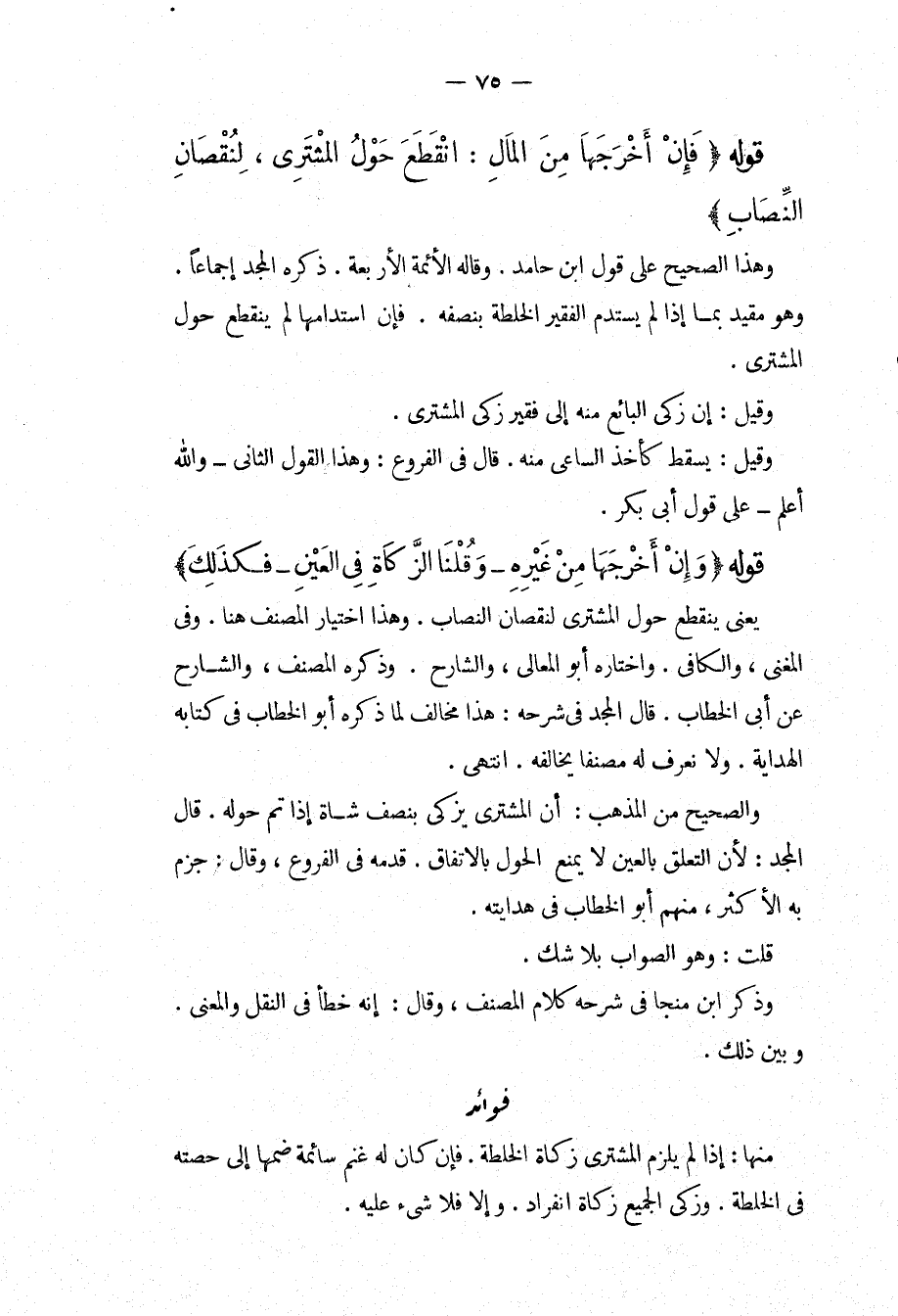 قَوْلُهُ (وَإِنْ أَخْرَجَهَا مِنْ غَيْرِهِ وَقُلْنَا الزَّكَاةُ فِي الْعَيْنِ فَكَذَلِكَ) يَعْنِي يَنْقَطِعُ حَوْلُ الْمُشْتَرِي لِنُقْصَانِ النِّصَابِ، وَهَذَا اخْتِيَارُ الْمُصَنِّفِ هُنَا، وَفِي الْمُغْنِي، وَالْكَافِي، وَاخْتَارَهُ أَبُو الْمَعَالِي، وَالشَّارِحُ، وَذَكَرَهُ الْمُصَنِّفُ، وَالشَّارِحُ عَنْ أَبِي الْخَطَّابِ، قَالَ الْمَجْدُ فِي شَرْحِهِ: هَذَا مُخَالِفٌ لِمَا ذَكَرَهُ أَبُو الْخَطَّابِ فِي كِتَابِهِ الْهِدَايَةِ، وَلَا نَعْرِفُ لَهُ مُصَنَّفًا يُخَالِفُهُ. انْتَهَى.