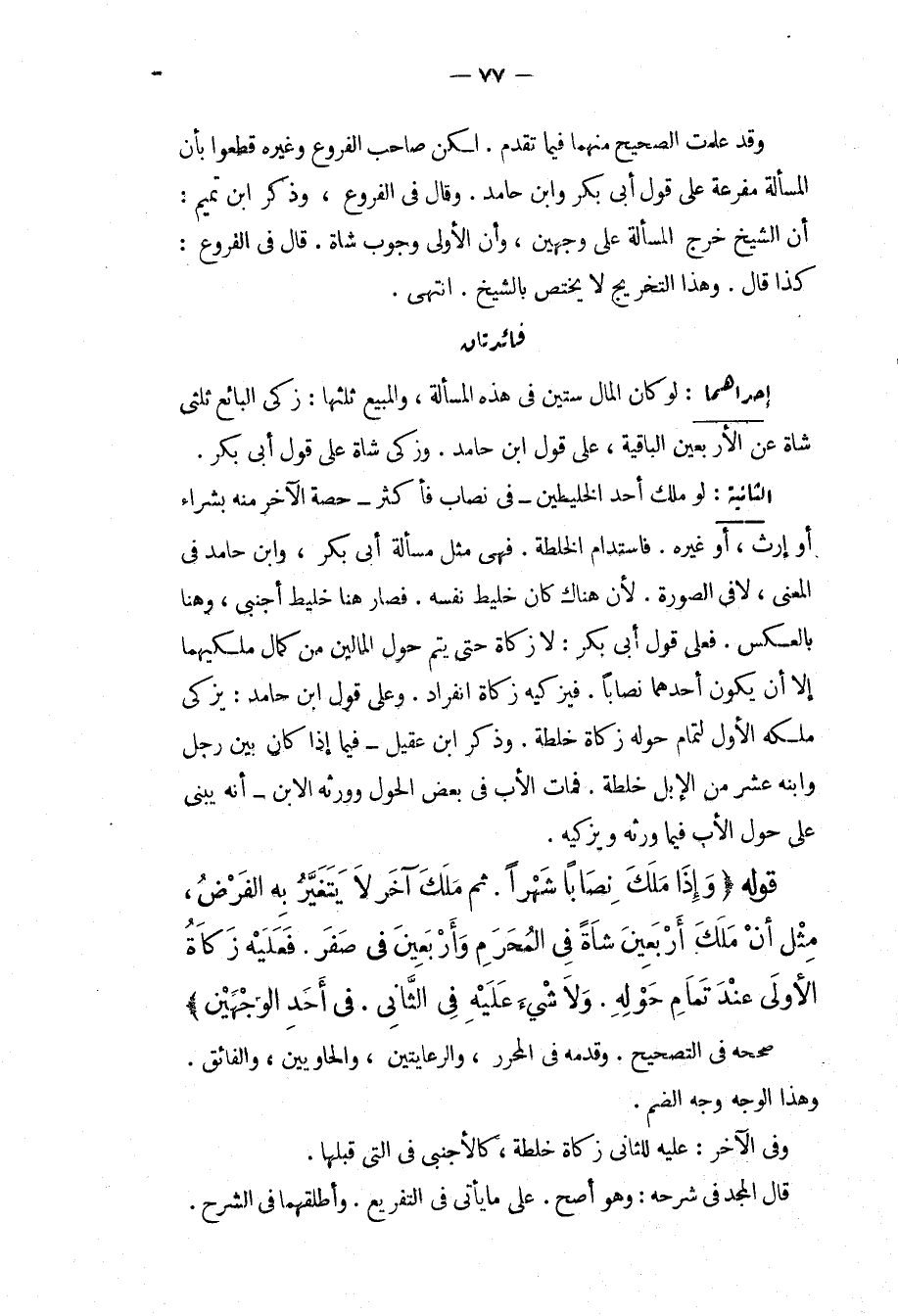 فَائِدَتَانِ. إحْدَاهُمَا: لَوْ كَانَ الْمَالُ سِتِّينَ فِي هَذِهِ الْمَسْأَلَةِ، وَالْمَبِيعُ ثُلُثَهَا: زَكَّى الْبَائِعُ ثُلُثَيْ شَاةٍ عَنْ الْأَرْبَعِينَ الْبَاقِيَةِ، عَلَى قَوْلِ ابْنِ حَامِدٍ، وَزَكَّى شَاةً عَلَى قَوْلِ أَبِي بَكْرٍ. الثَّانِيَةُ: لَوْ مَلَكَ أَحَدُ الْخَلِيطَيْنِ فِي نِصَابٍ فَأَكْثَرَ حِصَّةَ الْآخَرِ مِنْهُ بِشِرَاءٍ أَوْ إرْثٍ، أَوْ غَيْرِهِ، فَاسْتَدَامَ الْخُلْطَةَ، فَهِيَ مِثْلُ مَسْأَلَةِ أَبِي بَكْرٍ، وَابْنِ حَامِدٍ فِي الْمَعْنَى، لَا فِي الصُّورَةِ؛ لِأَنَّ هُنَاكَ كَانَ خَلِيطَ نَفْسِهِ، فَصَارَ هُنَا خَلِيطٌ أَجْنَبِيٌّ، وَهُنَا بِالْعَكْسِ. فَعَلَى قَوْلِ أَبِي بَكْرٍ: لَا زَكَاةَ حَتَّى يَتِمَّ حَوْلُ الْمَالَيْنِ مِنْ كَمَالِ مِلْكَيْهِمَا إلَّا أَنْ يَكُونَ أَحَدُهُمَا نِصَابًا، فَيُزَكِّيهِ زَكَاةَ انْفِرَادٍ، وَعَلَى قَوْلِ ابْنِ حَامِدٍ: يُزَكِّي مِلْكَهُ الْأَوَّلَ لِتَمَامِ حَوْلِهِ زَكَاةَ خُلْطَةٍ، وَذَكَرَ ابْنُ عَقِيلٍ فِيمَا إذَا كَانَ بَيْنَ رَجُلٍ وَابْنِهِ حَوْلٌ مِنْ الْإِبِلِ خُلْطَةً، فَمَاتَ الْأَبُ فِي بَعْضِ الْحَوْلِ وَوَرِثَهُ الِابْنُ أَنَّهُ يَبْنِي عَلَى حَوْلِ الْأَبِ فِيمَا وَرِثَهُ وَيُزَكِّيهِ.