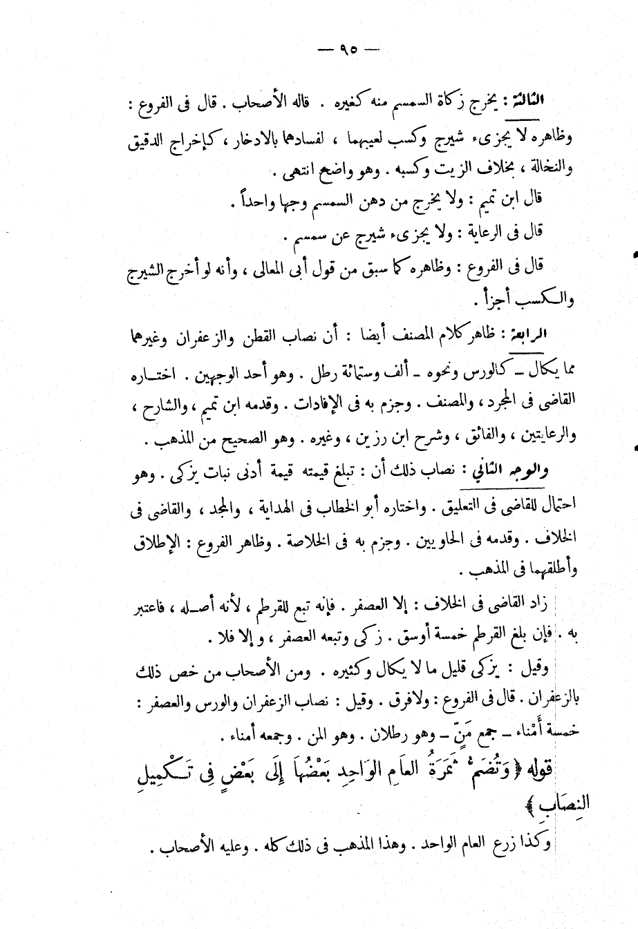 زَادَ الْقَاضِي فِي الْخِلَافِ: إلَّا الْعُصْفُرَ، فَإِنَّهُ لِلْقُرْطُمِ، لِأَنَّهُ أَصْلُهُ، فَاعْتُبِرَ بِهِ، فَإِنْ بَلَغَ الْقُرْطُمُ خَمْسَةَ أَوْسُقٍ، زُكِّيَ وَتَبِعَهُ الْعُصْفُرُ، وَإِلَّا فَلَا، وَقِيلَ: يُزَكَّى قَلِيلُ مَا لَا يُكَالُ وَكَثِيرُهُ، وَمِنْ الْأَصْحَابِ مَنْ خَصَّ ذَلِكَ بِالزَّعْفَرَانِ، قَالَ فِي الْفُرُوعِ: وَلَا فَرْقَ، وَقِيلَ: نِصَابُ الزَّعْفَرَانِ وَالْوَرْسِ وَالْعُصْفُرِ: خَمْسَةُ أَمْنَاءٍ جَمْعُ مَنٍّ وَهُوَ رَطْلَانِ، وَهُوَ الْمَنُّ، وَجَمْعُهُ أَمْنَاءٌ.
