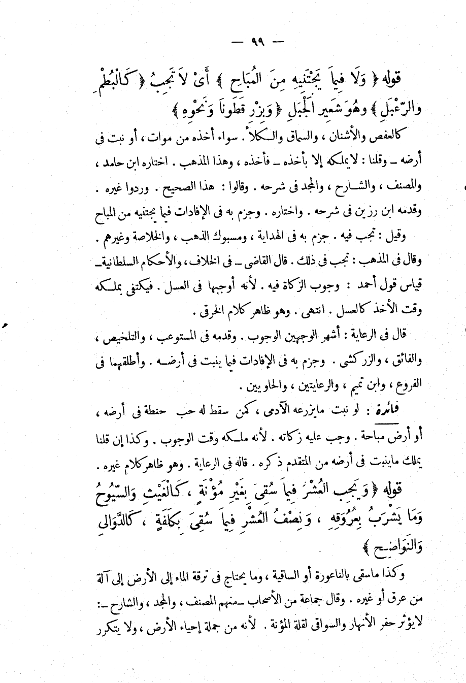 قَوْلُهُ (وَلَا فِيمَا يَجْتَنِيهِ مِنْ الْمُبَاحِ) أَيْ لَا تَجِبُ (كَالْبُطْمِ وَالرَّعْبَلِ) وَهُوَ شَعِيرُ الْجَبَلِ (وَبِزِرٍّ قُطُونًا وَنَحْوَهُ) كَالْعَفْصِ وَالْأُشْنَانِ، وَالسُّمَّاقِ وَالْكَلَأِ، سَوَاءٌ أَخَذَهُ مِنْ مَوَاتٍ، أَوْ نَبَتَ فِي أَرْضِهِ وَقُلْنَا: لَا يَمْلِكُهُ إلَّا بِأَخْذِهِ فَأَخَذَهُ، وَهَذَا الْمَذْهَبُ اخْتَارَهُ ابْنُ حَامِدٍ، وَالْمُصَنِّفُ، وَالشَّارِحُ، وَالْمَجْدُ فِي شَرْحِهِ، وَقَالُوا: هَذَا الصَّحِيحُ، وَرَدُّوا غَيْرَهُ. وَقَدَّمَهُ ابْنُ رَزِينٍ فِي شَرْحِهِ، وَاخْتَارَهُ، وَجَزَمَ بِهِ فِي الْإِفَادَاتِ فِيمَا يَجْتَنِيهِ مِنْ الْمُبَاحِ وَقِيلَ: تَجِبُ فِيهِ، جَزَمَ بِهِ فِي الْهِدَايَةِ، وَمَسْبُوكِ الذَّهَبِ، وَالْخُلَاصَةِ وَغَيْرِهِمْ، وَقَالَ فِي الْمُذْهَبِ: تَجِبُ فِي ذَلِكَ، قَالَ الْقَاضِي فِي الْخِلَافِ، وَالْأَحْكَامِ السُّلْطَانِيَّةِ قِيَاسُ قَوْلِ أَحْمَدَ: وُجُوبُ الزَّكَاةِ فِيهِ؛ لِأَنَّهُ أَوْجَبَهَا فِي الْعَسَلِ، فَيُكْتَفَى بِمِلْكِهِ وَقْتَ الْأَخْذِ كَالْعَسَلِ. انْتَهَى. وَهُوَ ظَاهِرُ كَلَامِ الْخِرَقِيِّ، قَالَ فِي الرِّعَايَةِ: أَشْهَرُ الْوَجْهَيْنِ الْوُجُوبُ، وَقَدَّمَهُ فِي الْمُسْتَوْعِبِ، وَالتَّلْخِيصِ، وَالْفَائِقِ، وَالزَّرْكَشِيُّ، وَجَزَمَ بِهِ فِي الْإِفَادَاتِ فِيمَا يَنْبُتُ فِي أَرْضِهِ، وَأَطْلَقَهُمَا فِي الْفُرُوعِ، وَابْنُ تَمِيمٍ، وَالرِّعَايَتَيْنِ، وَالْحَاوِيَيْنِ.