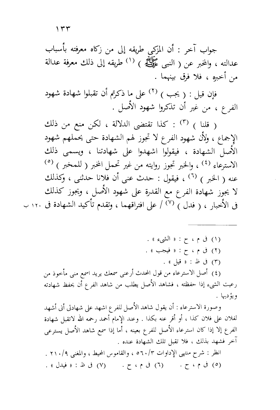 (قلنا): كذا تقتضي الدلالة، لكن منع من ذلك الإجماع، ولأن شهود الفرع لا تجوز لهم الشهادة حتى يحملهم شهود الأصل الشهادة، فيقولوا اشهدوا على شهادتنا، ويسمى ذلك الاسترعاء، والخبر تجوز روايته من غير تحمل المخبر (للمخبر) عنه (الخبر)، فيقول: حدث عني أن فلاناً حدثني، وكذلك لا يجوز شهادة الفرع مع القدرة على شهود الأصل، ويجوز كذلك في الأخبار، (فدل) / على افتراقهما، وتقدم تأكيد الشهادة في