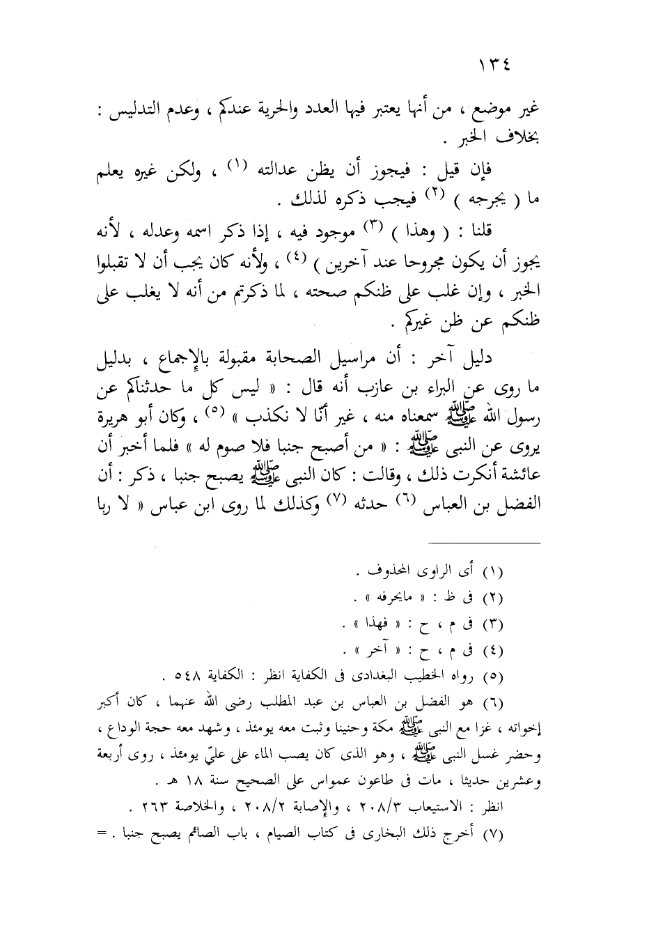 دليل آخر: أن مراسيل الصحابة مقبولة بالإجماع، بدليل ما روى عن البراء بن عازب أنه قال: "ليس كل ما حدثناكم عن رسول الله صلى الله عليه وسلم سمعناه منه، غير أنا لا نكذب"، وكان أبو هريرة يروي عن النبي صلى الله عليه وسلم: "من أصبح جنبا فلا صوم له" فلما أخبر أن عائشة أنكرت ذلك، وقالت: كان النبي صلى الله عليه وسلم يصبح جنباً، ذكر: أن الفضل بن العباس حدثه وكذلك لما روى ابن عباس "لا ربا