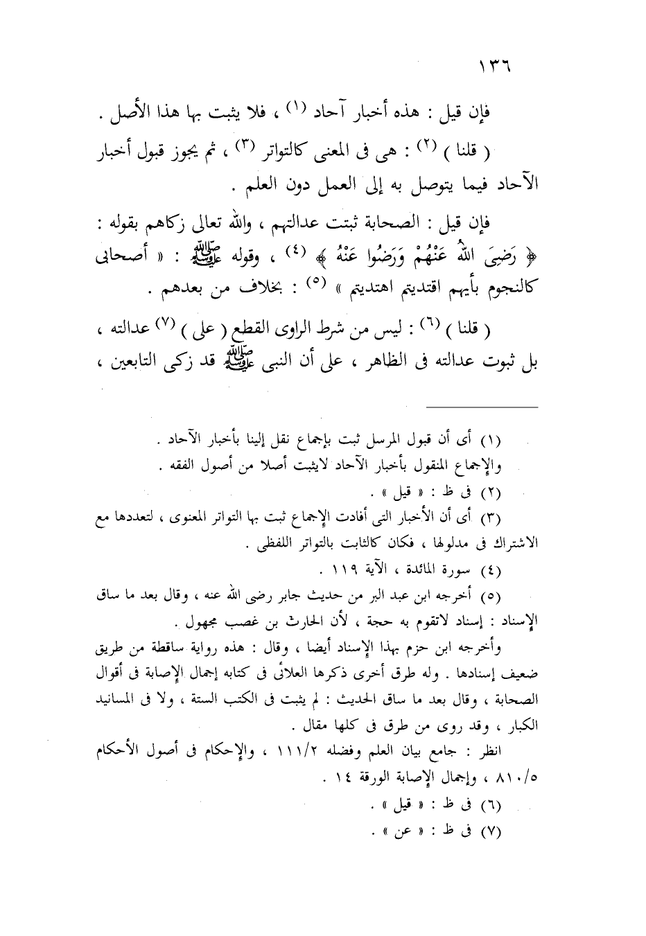 فإن قيل: الصحابة ثبتت عدالتهم، والله تعالى زكاهم بقوله: {رَضِيَ اللَّهُ عَنْهُمْ وَرَضُوا عَنْهُ} وقوله صلى الله عليه وسلم: "أصحابي كالنجوم بأيهم اقتديتم اهتديتم": بخلاف من بعدهم.