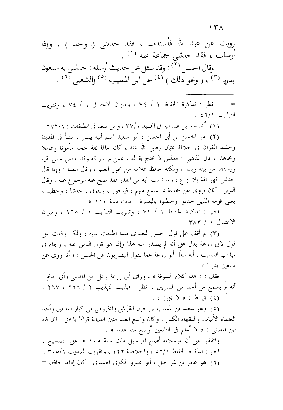 وقال الحسن: وقد سئل عن حديث أرسله: حدثني به سبعون بدرياً، (ونحو ذلك) عن ابن المسيب والشعبي.
